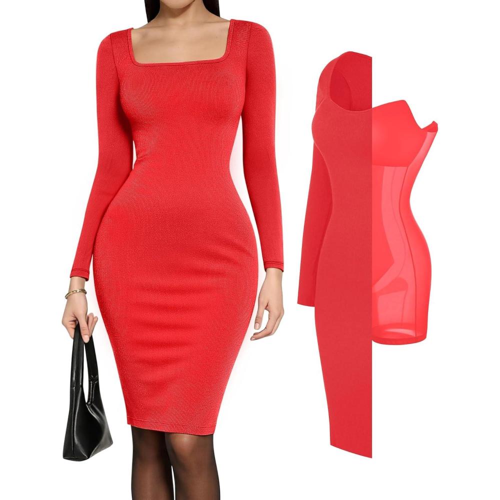 Popilush Cocktail Dress Long Sleeve Square Neck Midi Dress Shapewear Tummy Control Bodycon Dress Party Evening Built in Bra(Red Midi Dress)