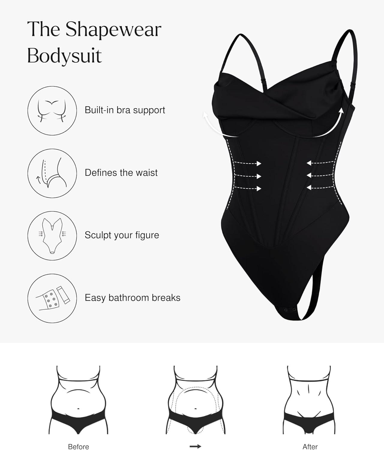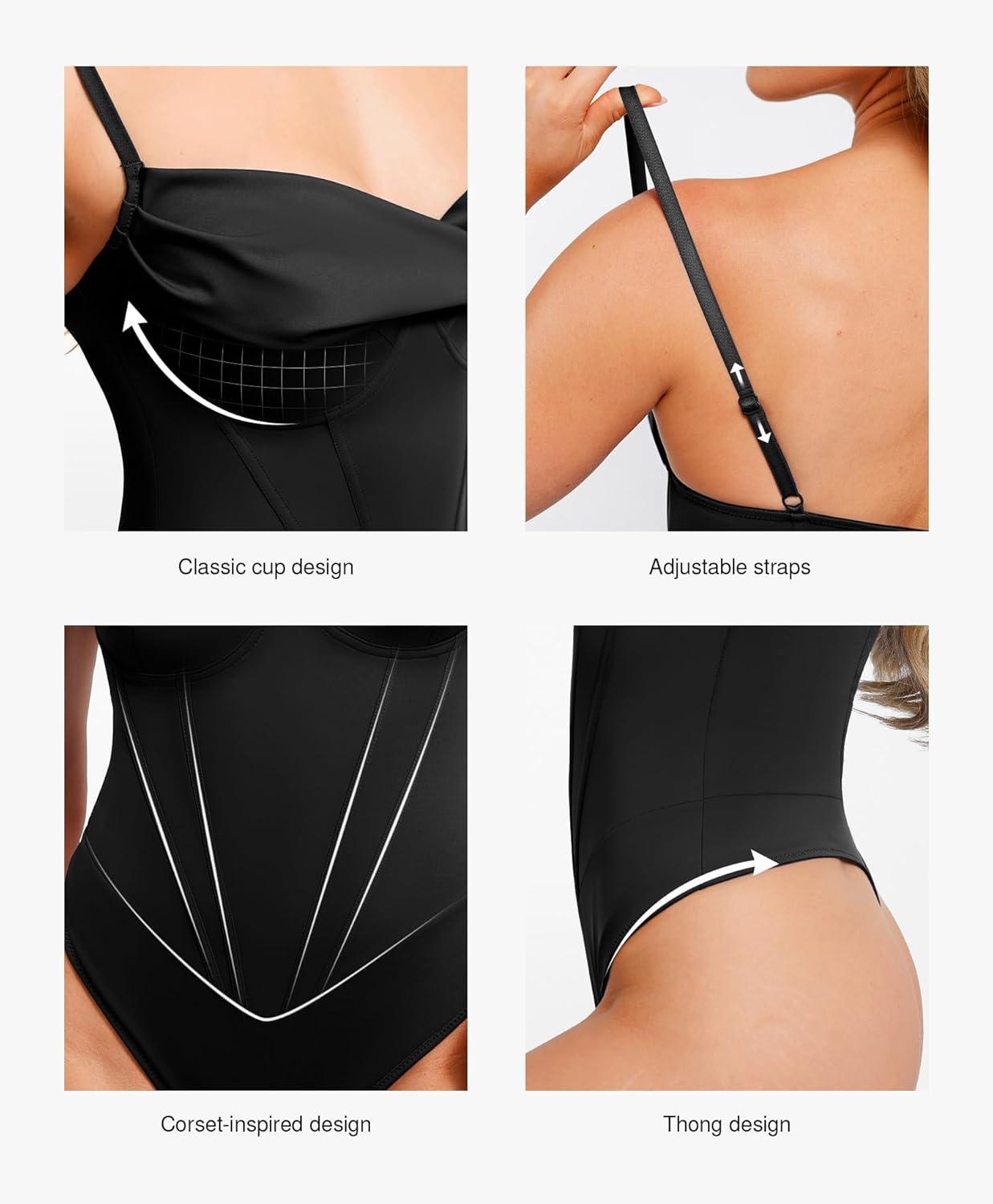 Popilush Corset Bodysuit for Women Tummy Control Shapewear Bodysuits Cowl Neck Tops Concert Outfits(Black)