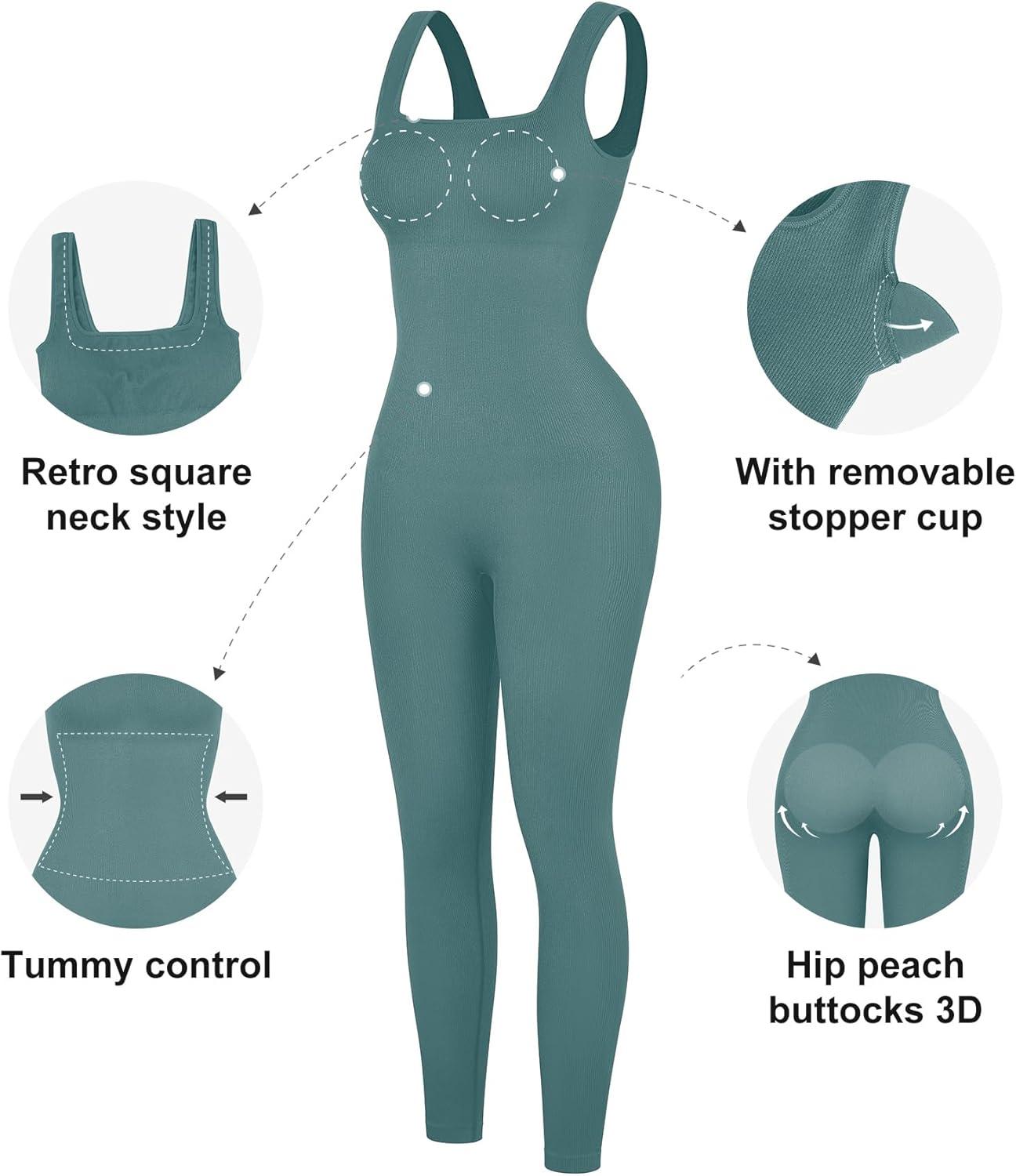 imagePopilush Jumpsuits for Women BuiltIn Bra Square Neck Ribbed Bodycon Workout Seamless Leggings Rompers BodysuitsBlue