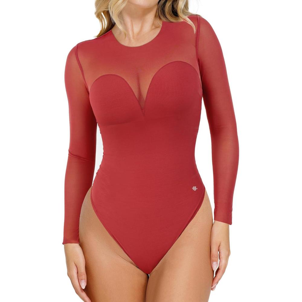 Popilush Long Sleeve Body Suits Womens Tummy Control Mesh Shapewear Corset Bodysuit Sheer Going Out Tops Fall Outfits(Red)