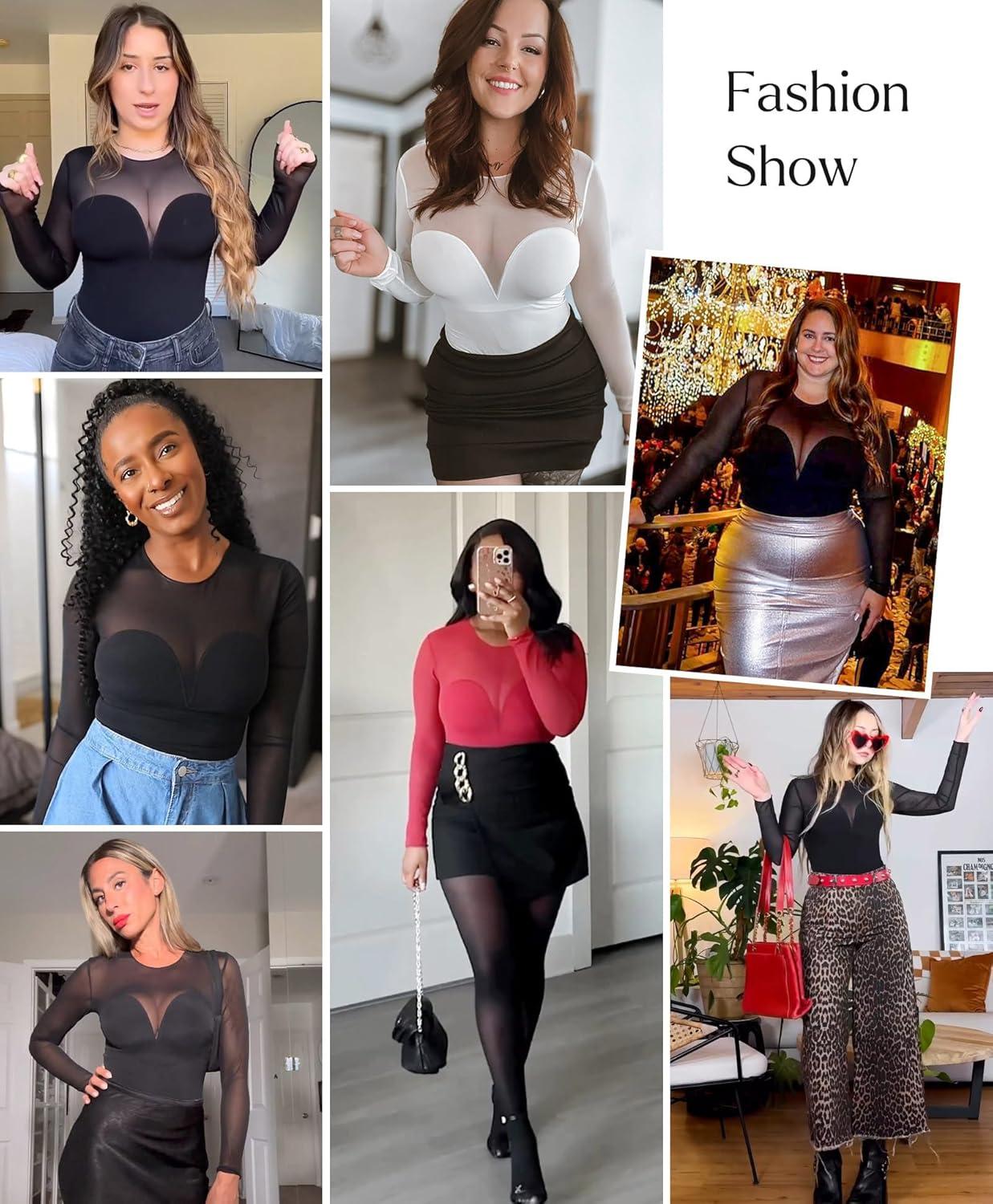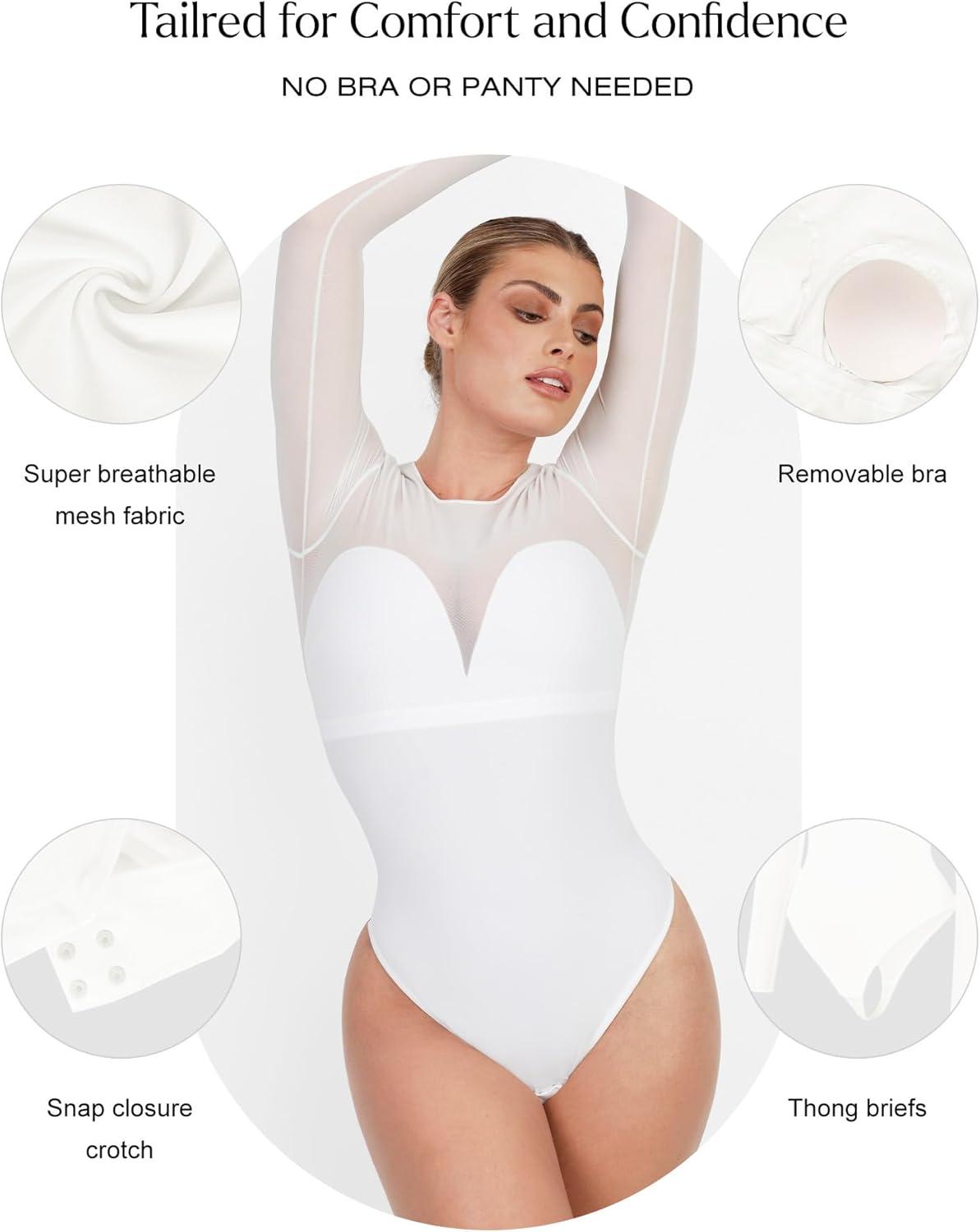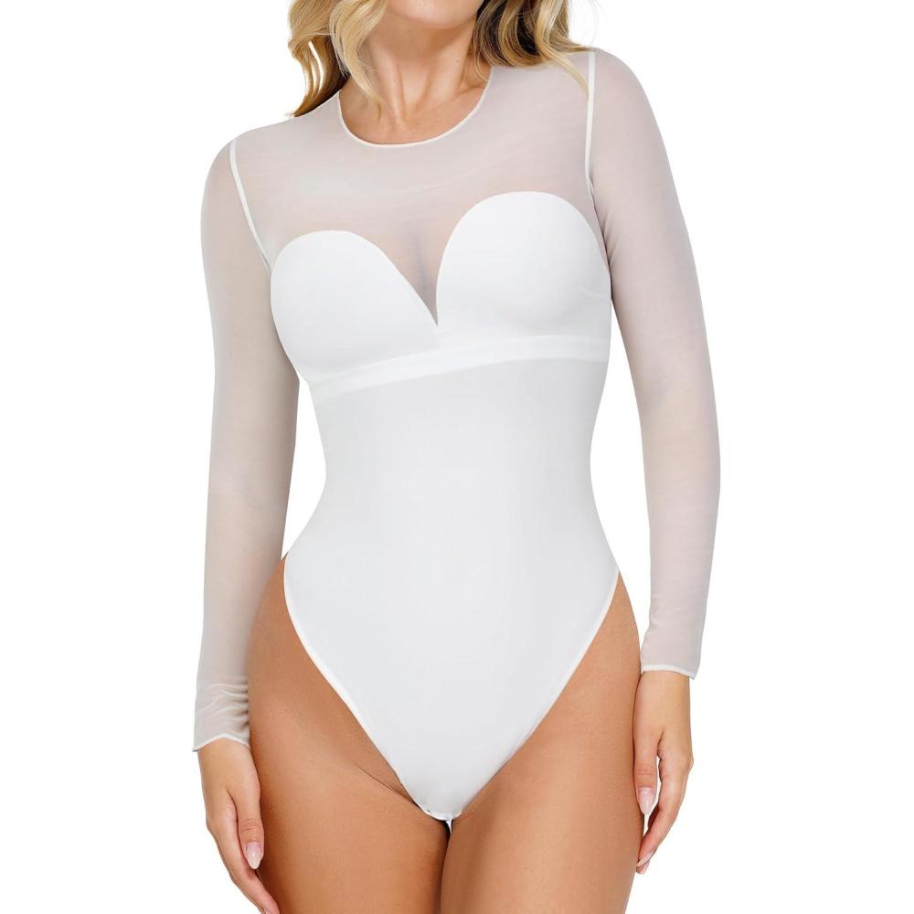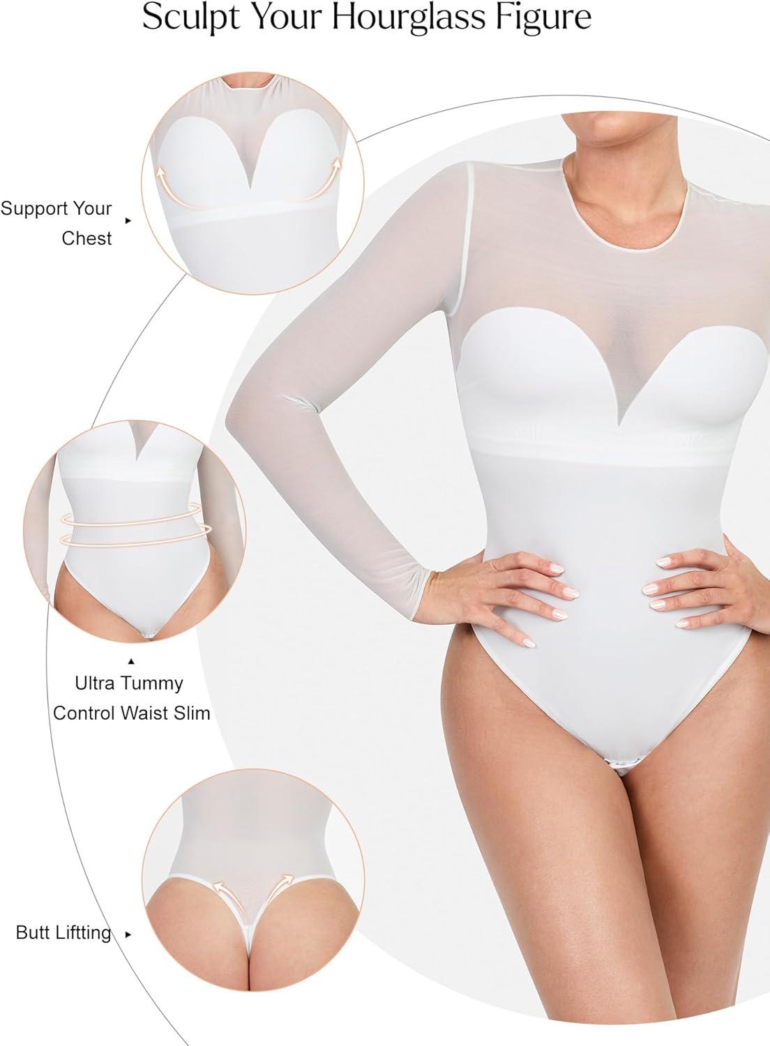 Popilush Long Sleeve Body Suits Womens Tummy Control Mesh Shapewear Corset Bodysuit Sheer Going Out Tops Fall Outfits(White)