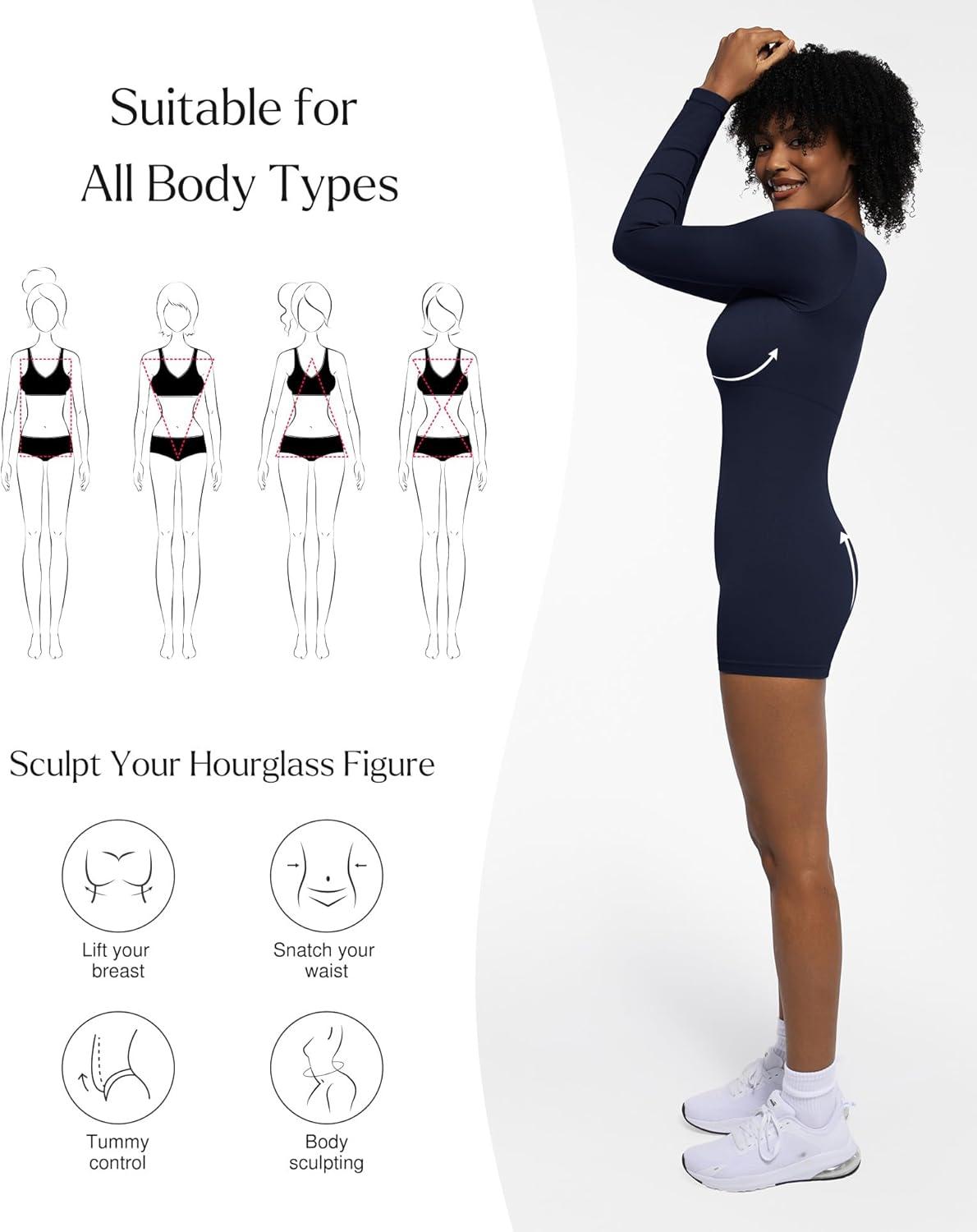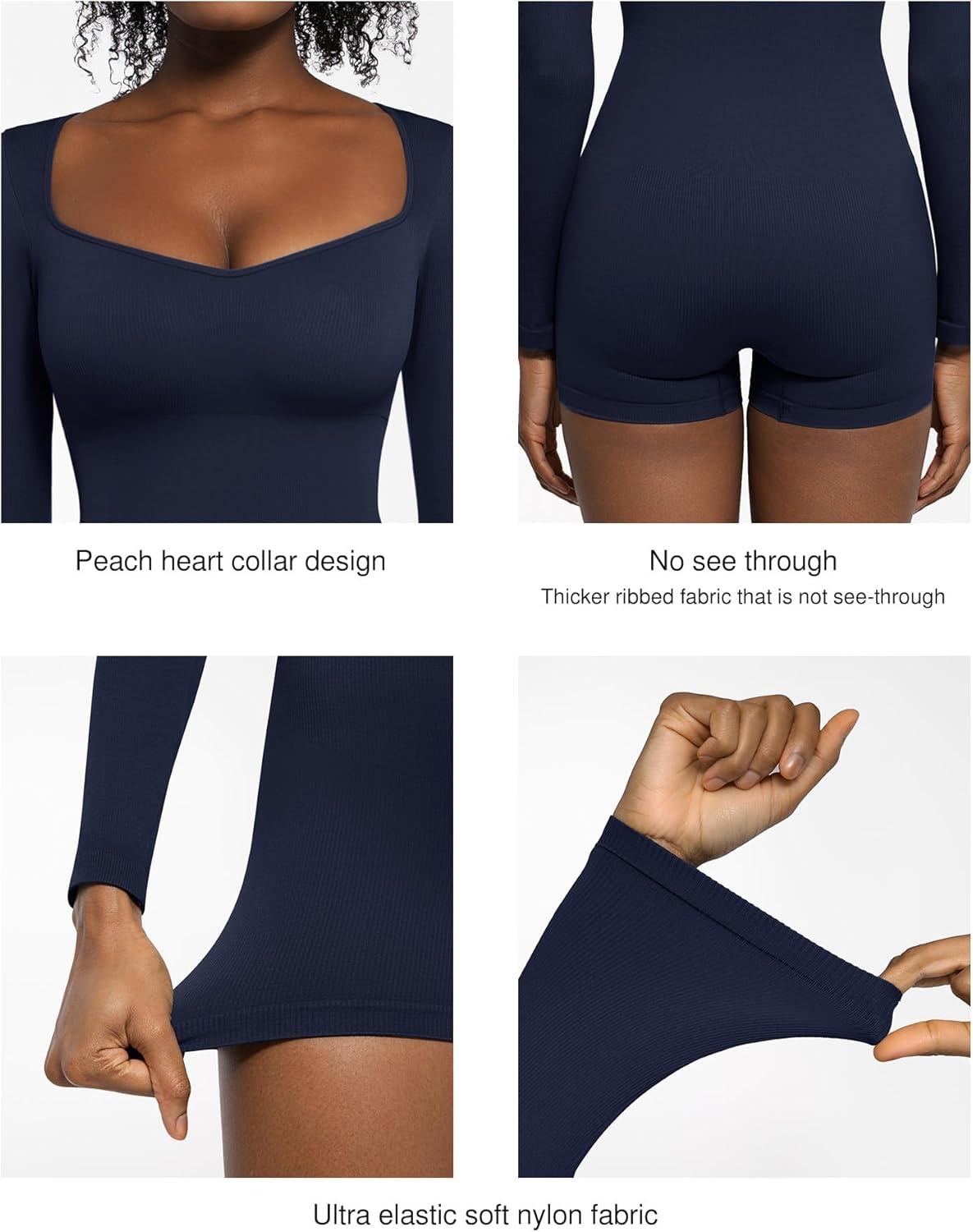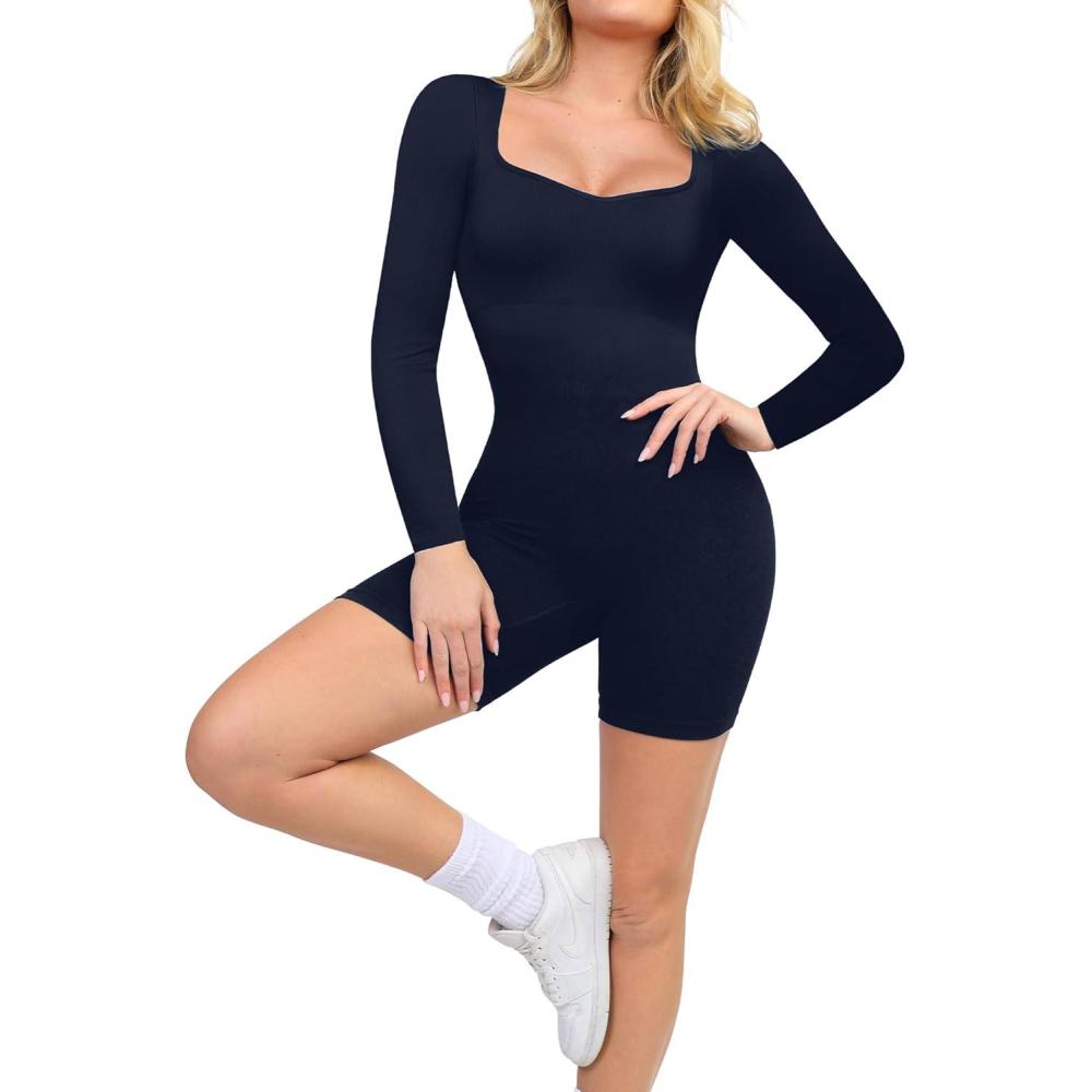 imagePopilush Long Sleeve Jumpsuit for Women Athletic Romper Ribbed Full Workout Bodysuit Shorts Yoga Sweetheart Neck Body SuitsBlue