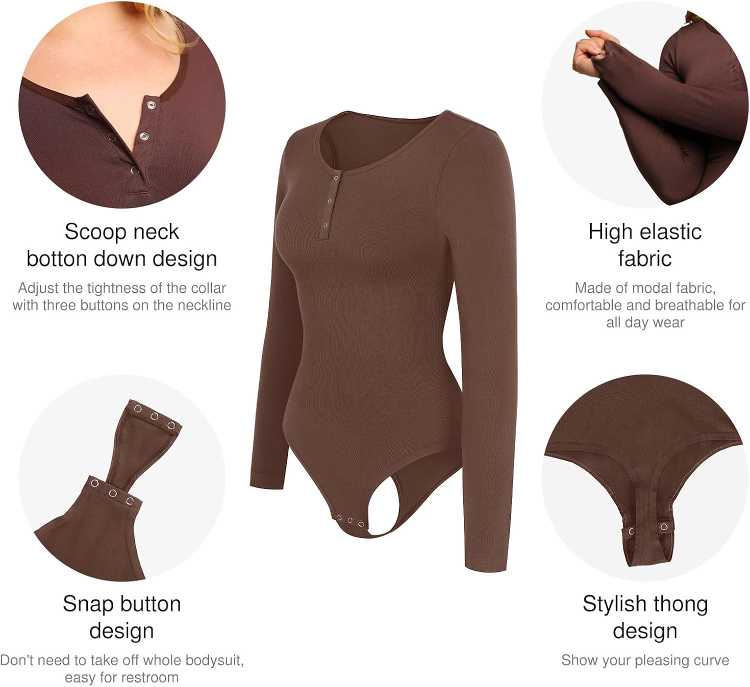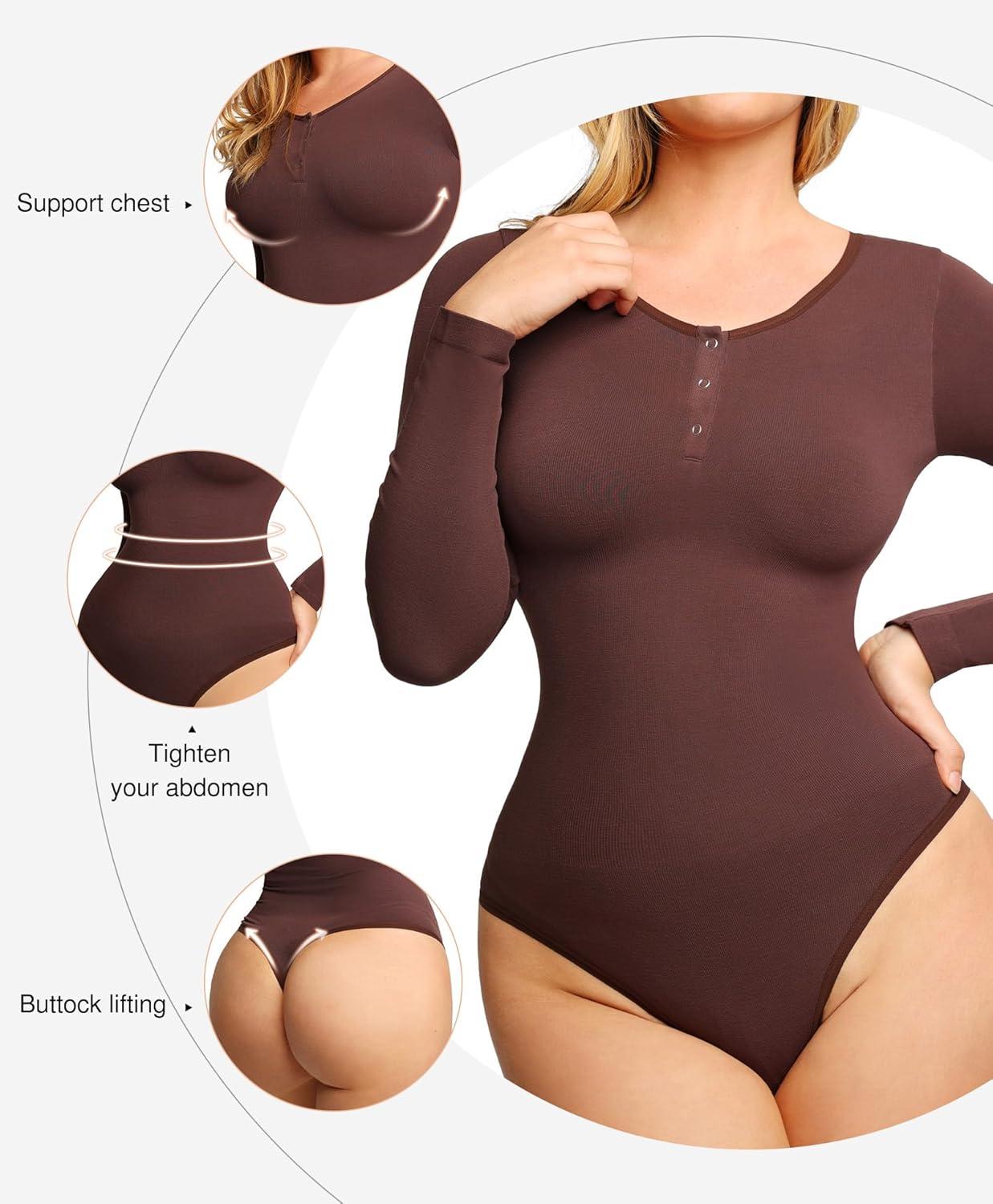 Popilush Long Sleeve Shapewear Bodysuit Tummy Control Henley Button Up Modal Scoop Neck Body Suit Tank Tops(Brown)