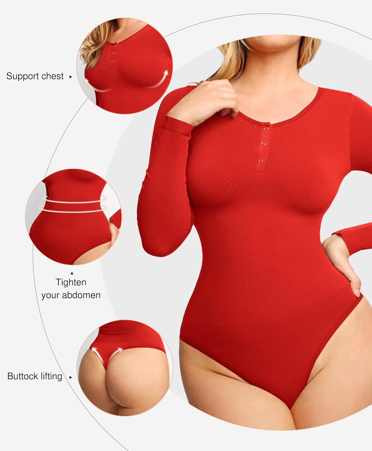 Popilush Long Sleeve Shapewear Bodysuit Tummy Control Henley Button Up Modal Scoop Neck Body Suit Tank Tops(Red)