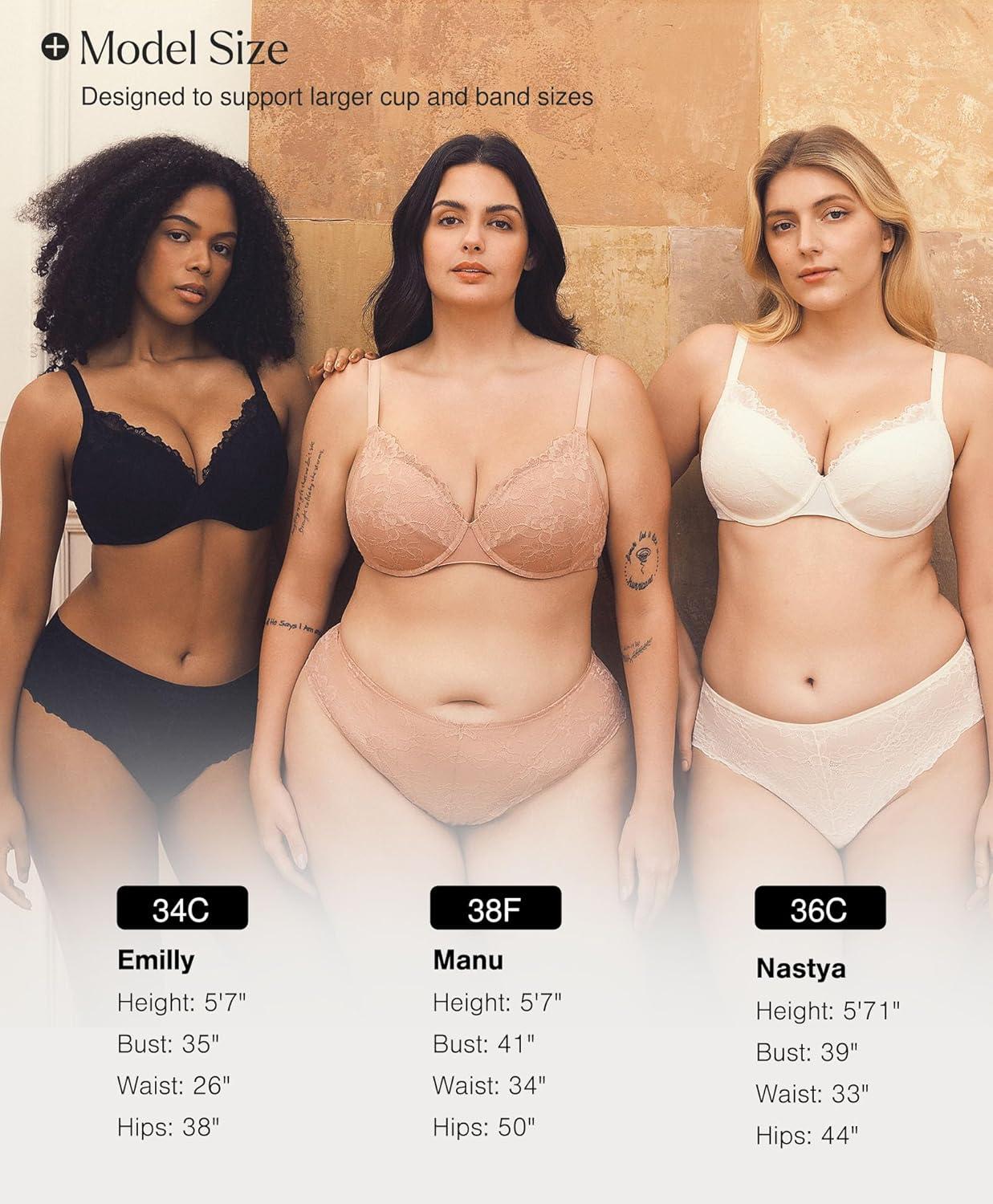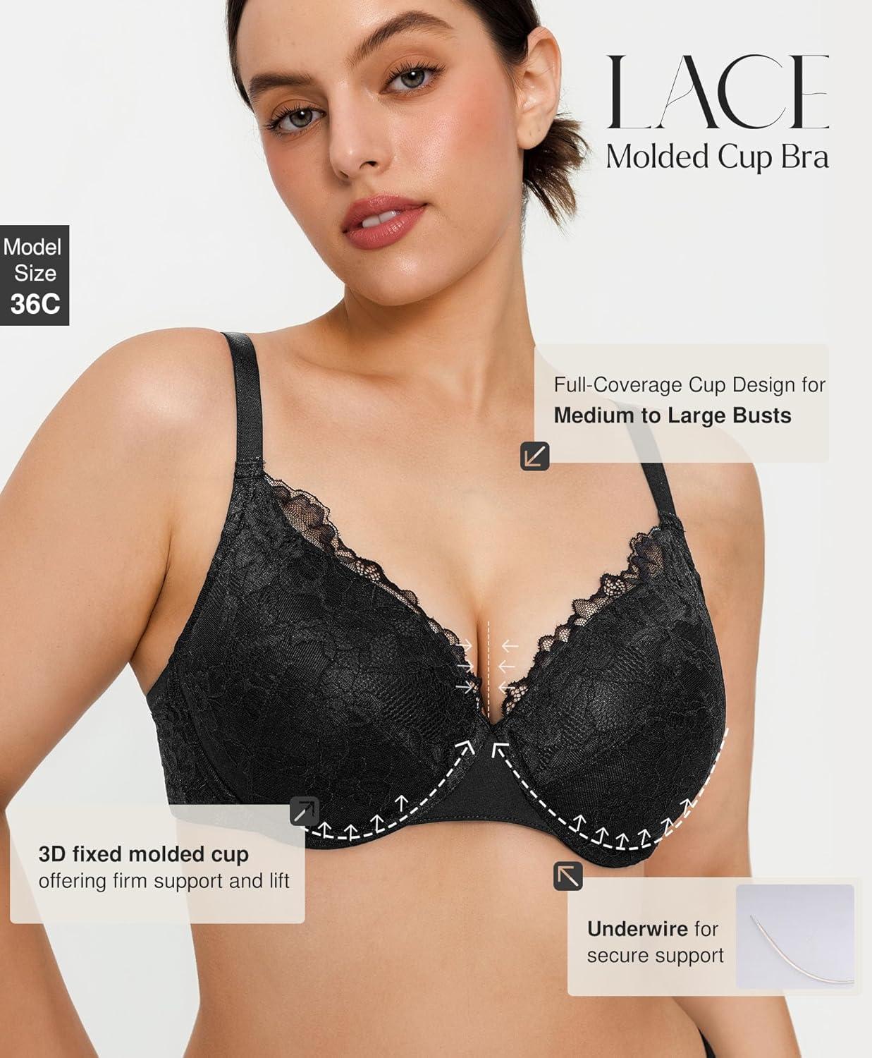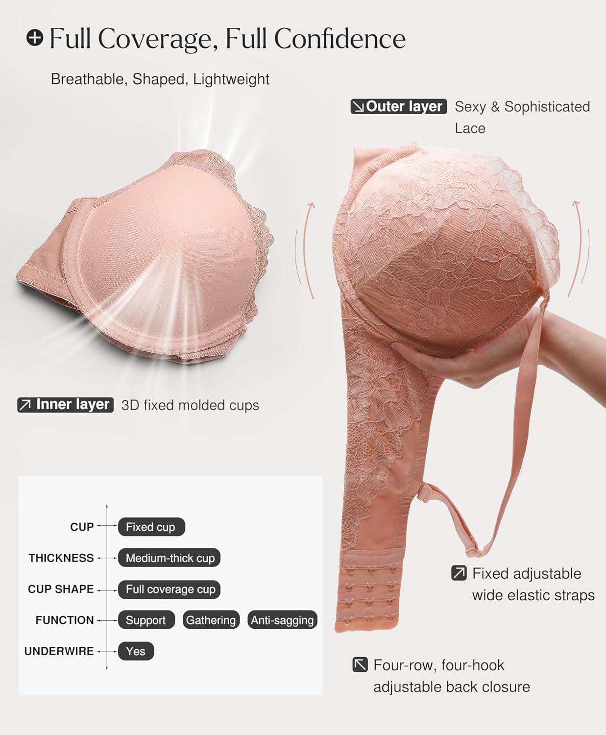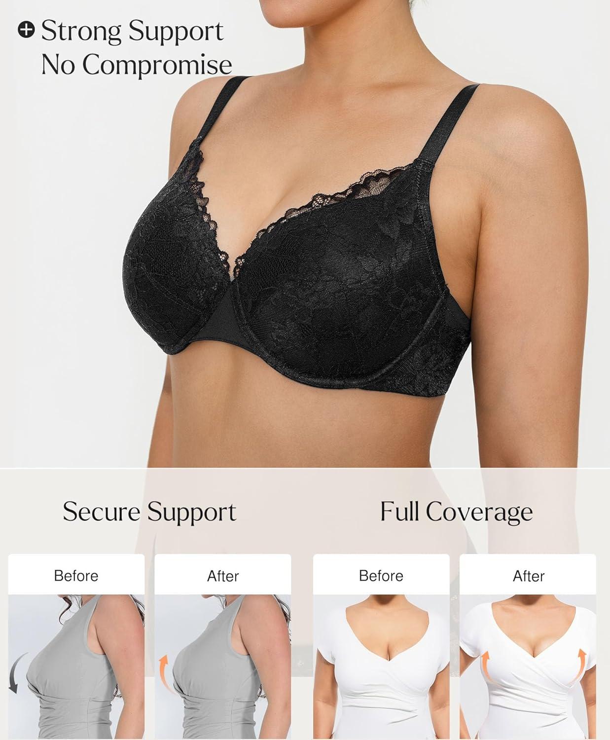 Popilush Minimizer Bras for Women – Push Up Full Coverage Lace Plus Size Underwire Bra with Support(Black)