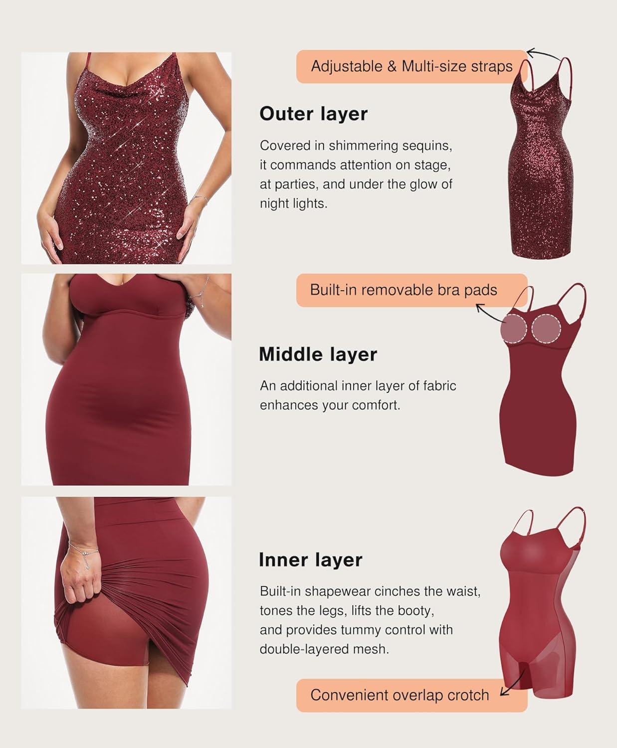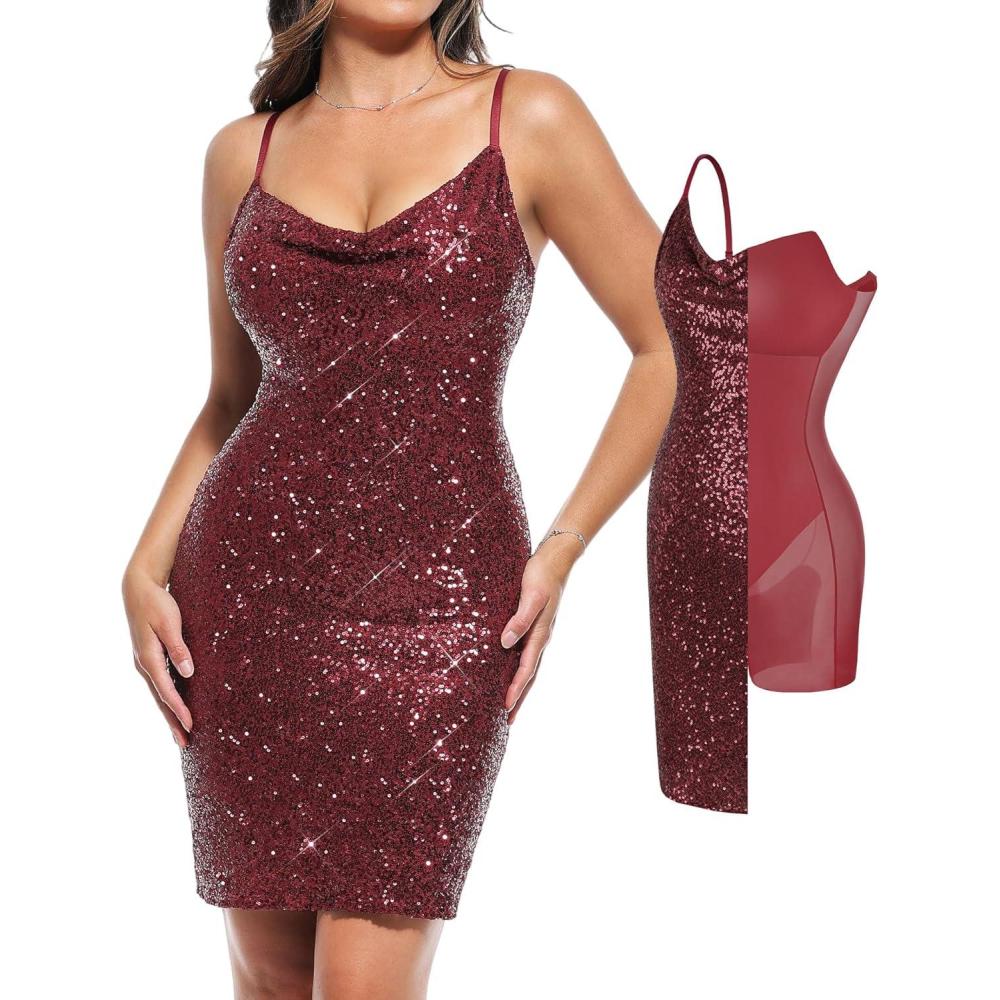 Popilush Sequin Mini Dress for Women – Slimming Shapewear with Cowl Neck Bodycon Sparkly Gown Cocktail Party and Club(Red)