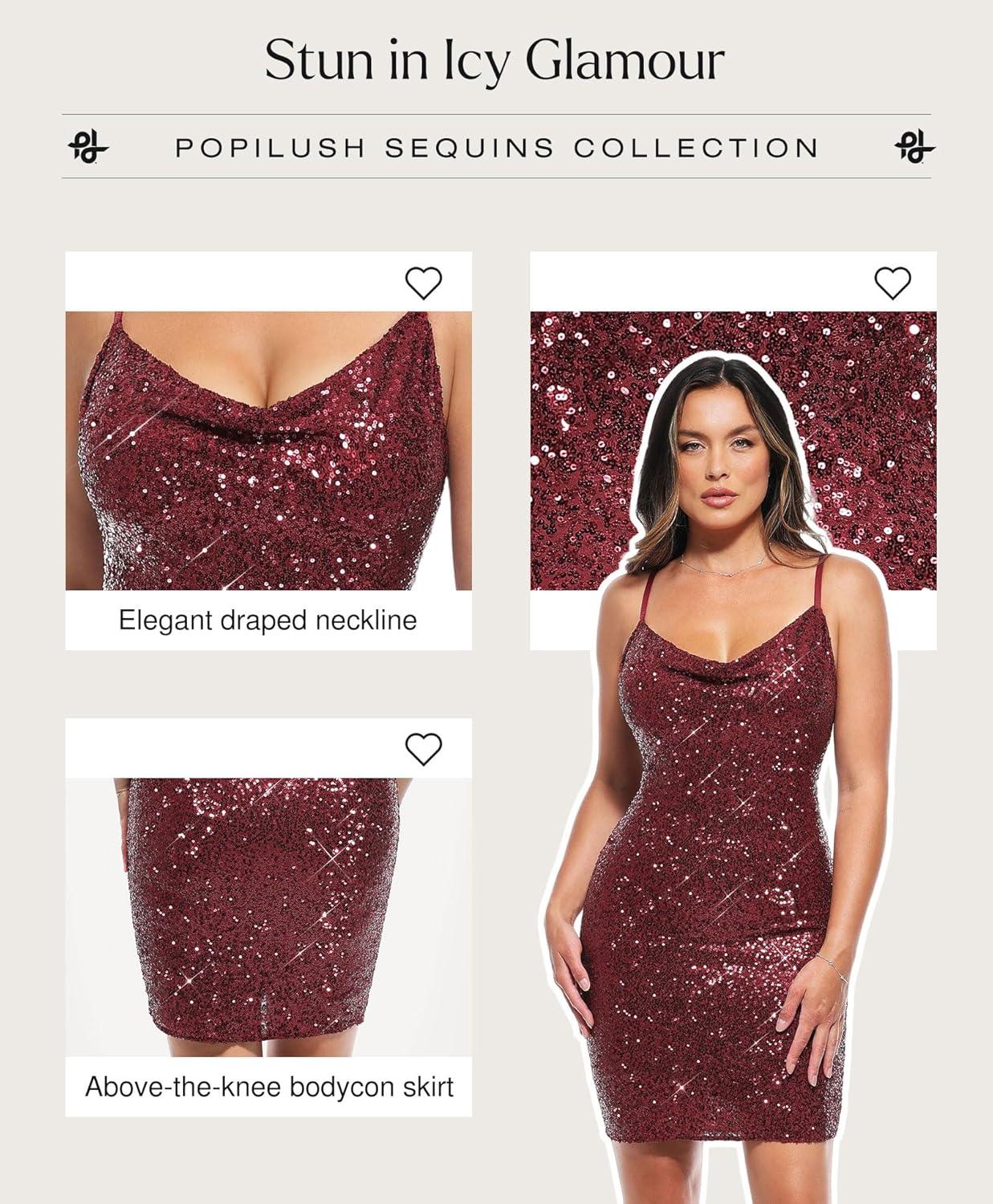 imagePopilush Sequin Mini Dress for Women  Slimming Shapewear with Cowl Neck Bodycon Sparkly Gown Cocktail Party and ClubRed