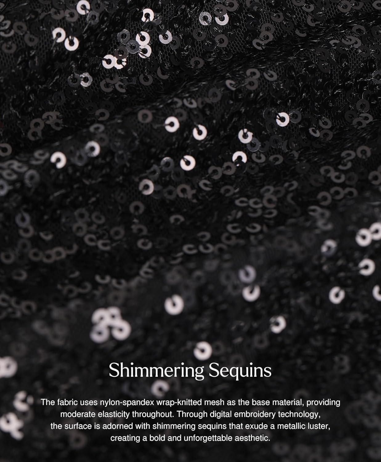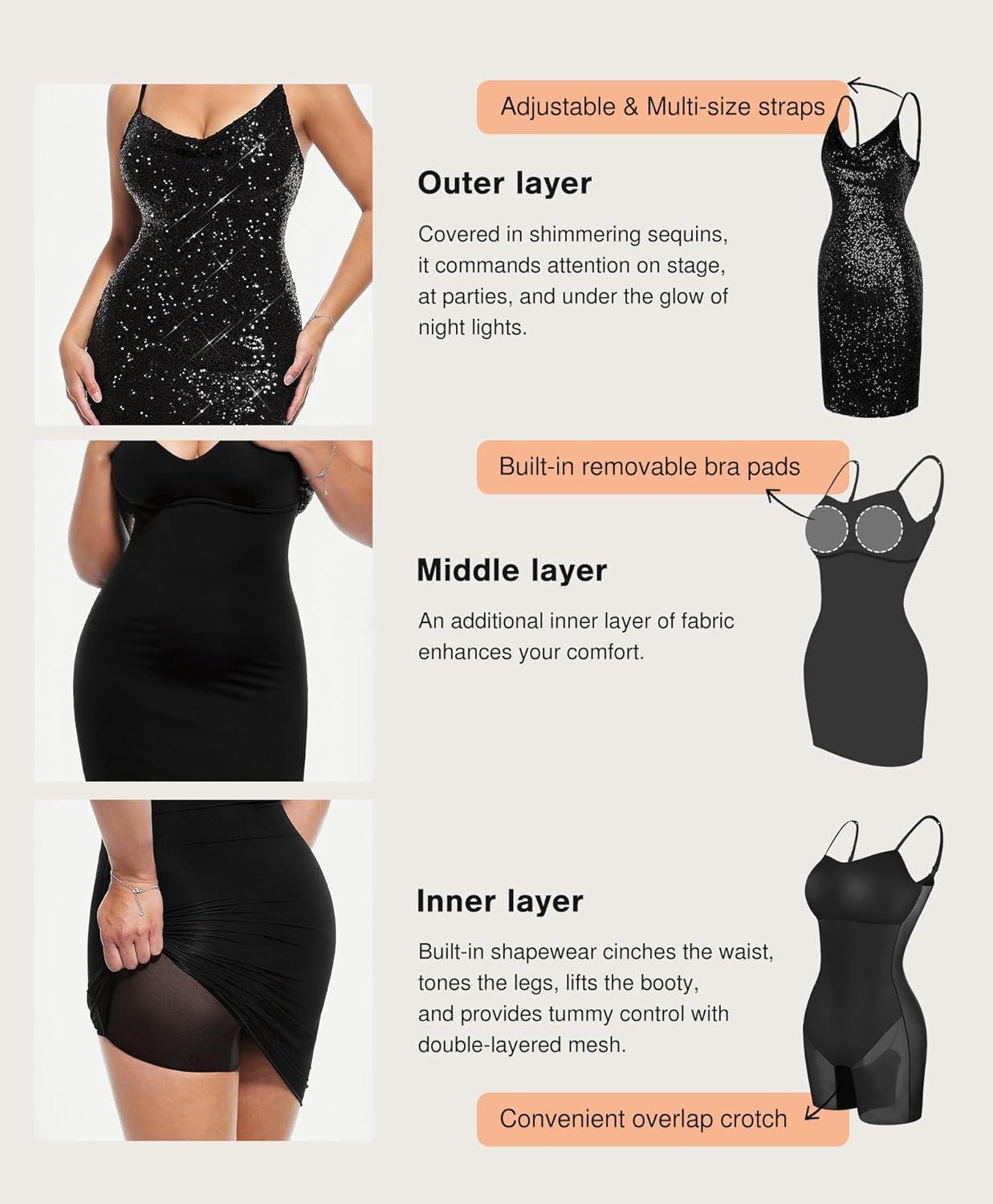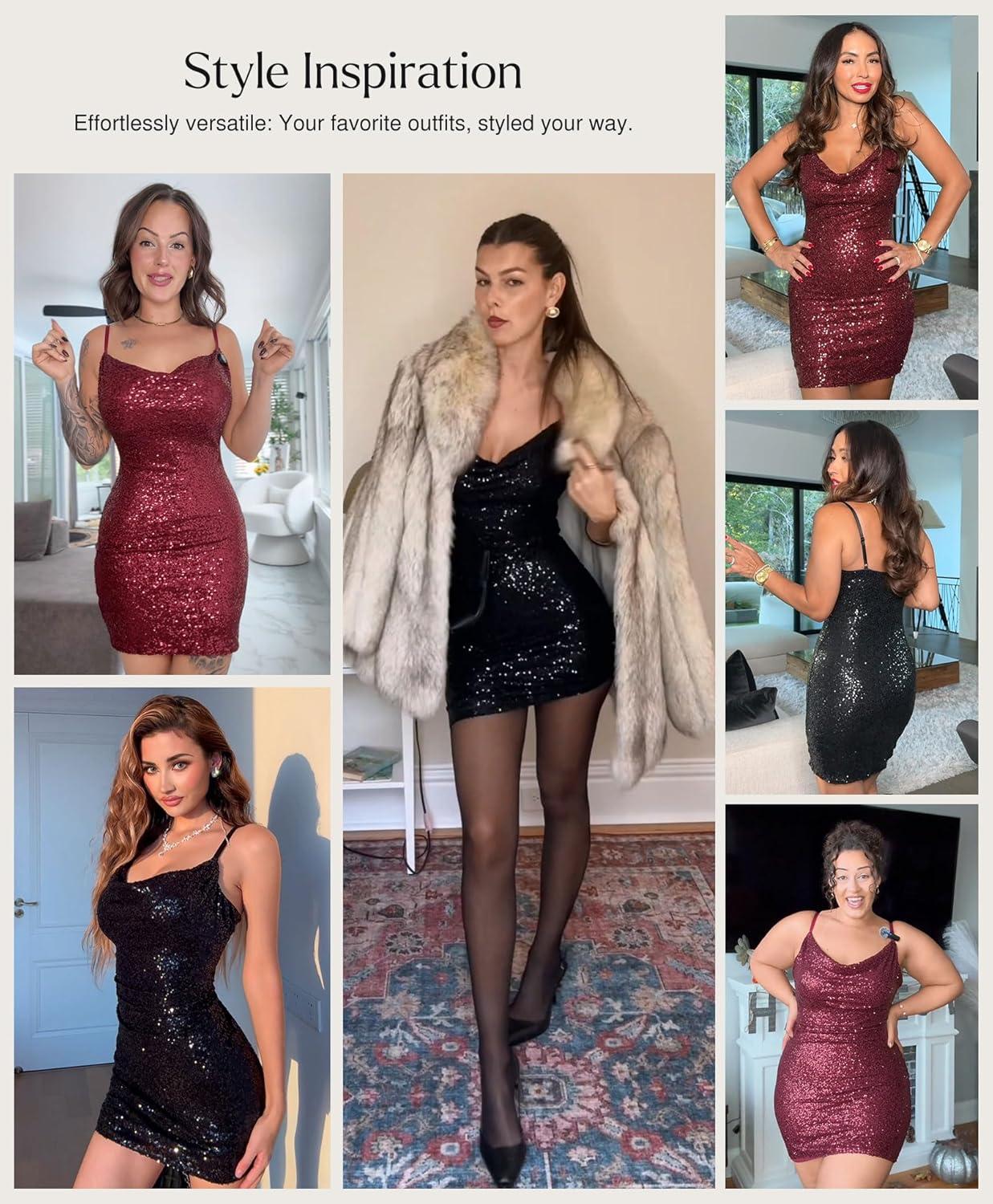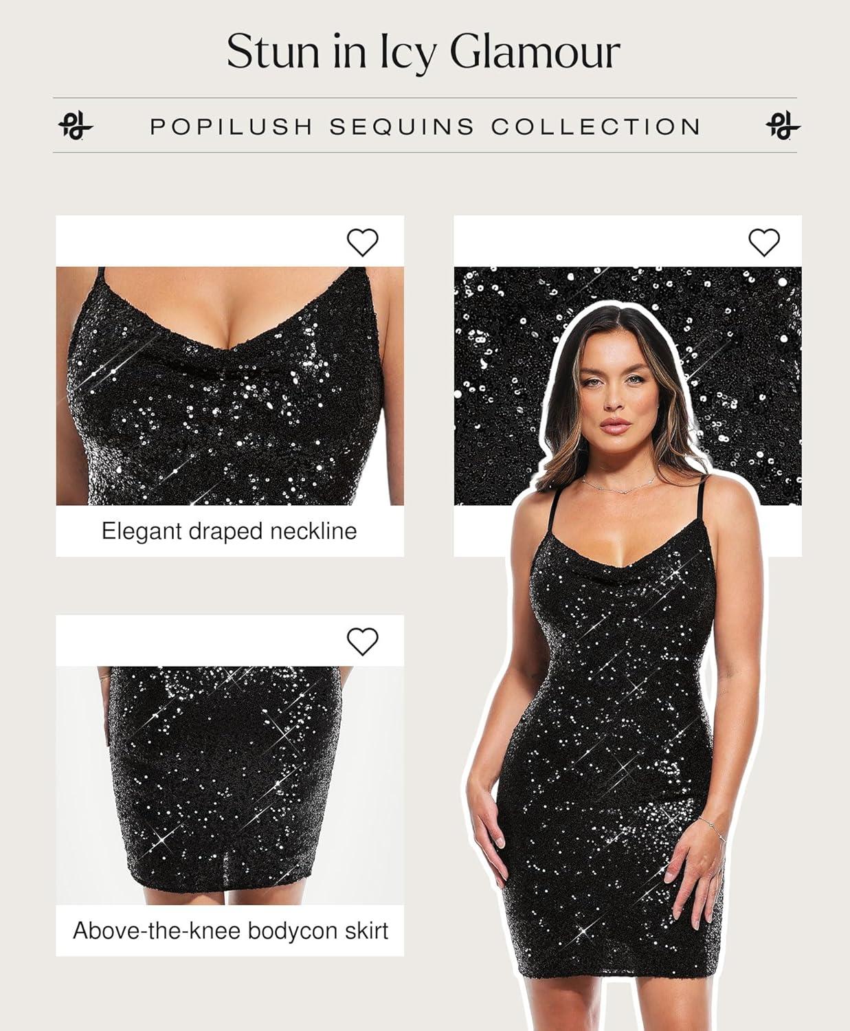 Popilush Sequin Mini Dress for Women Slimming Shapewear with Cowl Neck Bodycon Sparkly Gown for Cocktail Party & Club(Black)