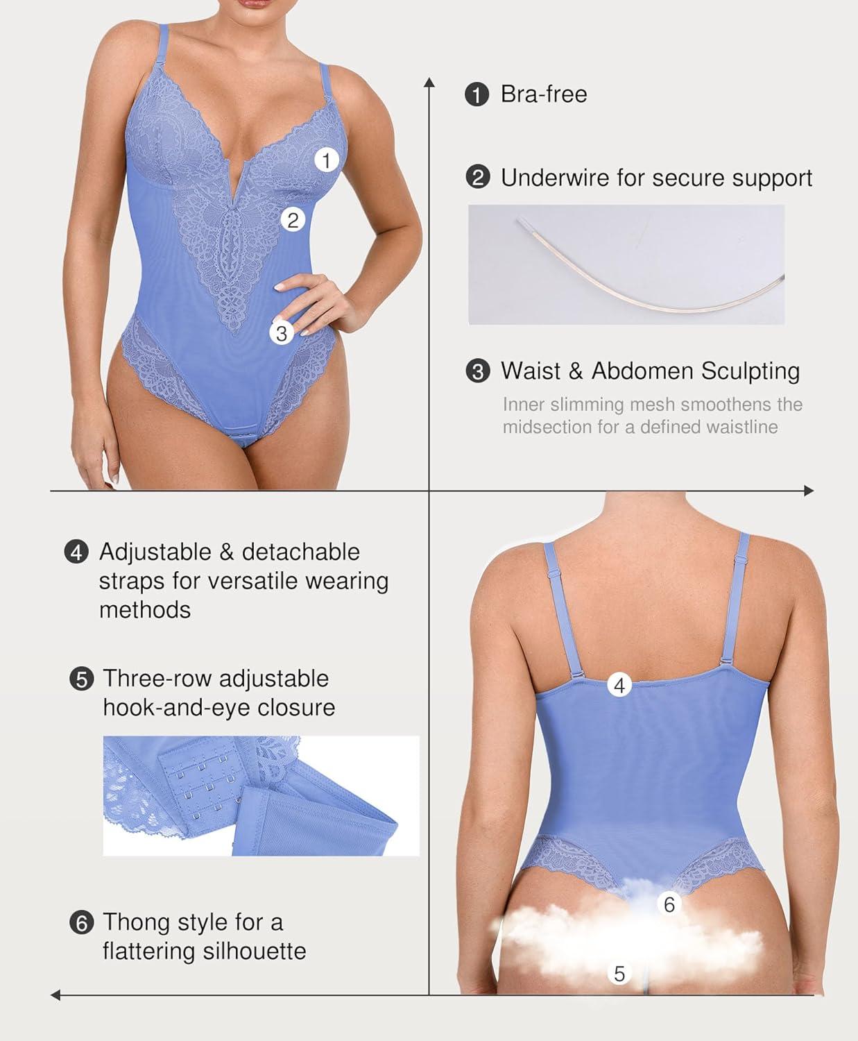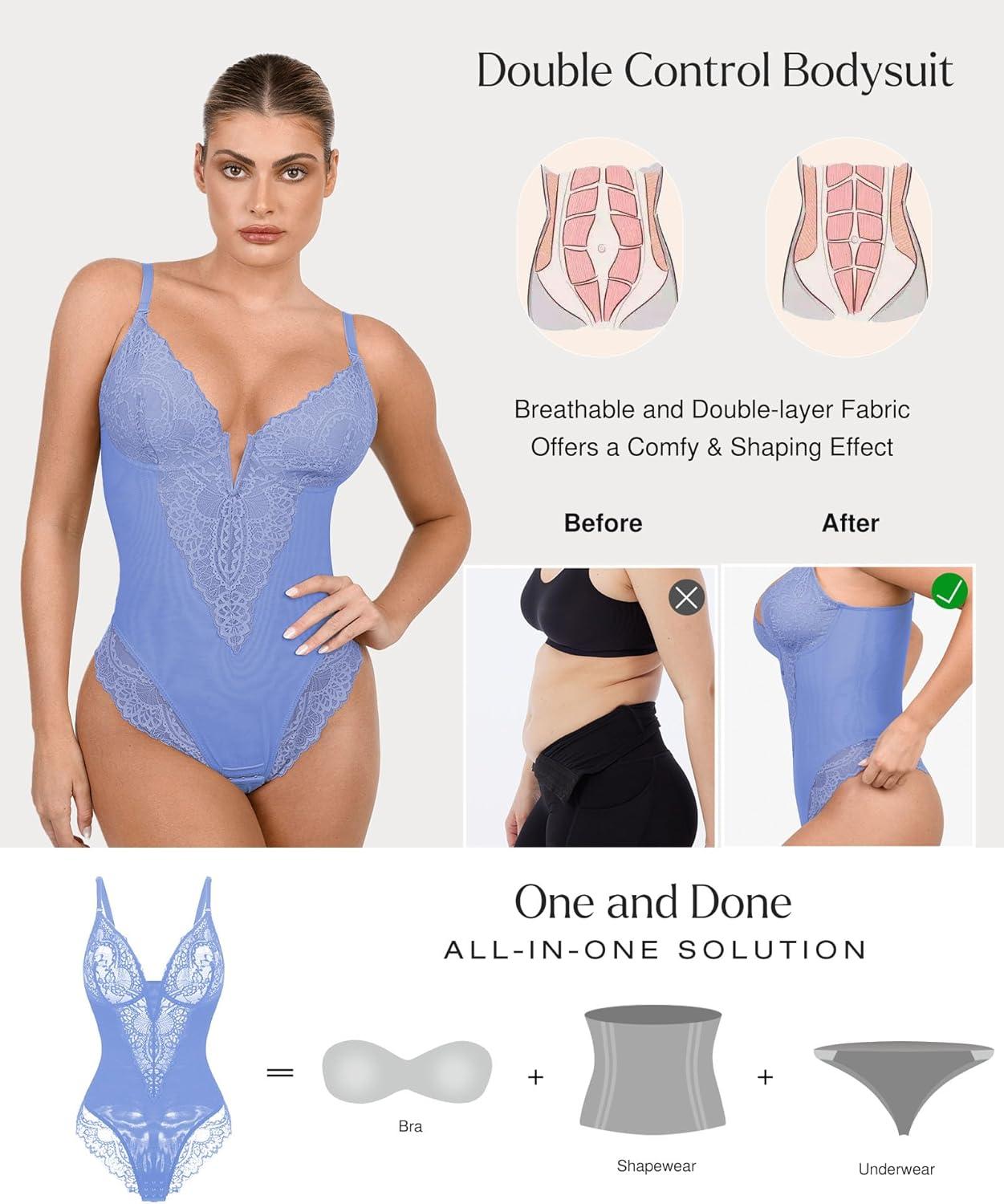 Popilush Shapewear Bodysuits for Women Lace Corset Tops Tummy Control V Neck Sleeveless Body Suit Thongs(Blue)