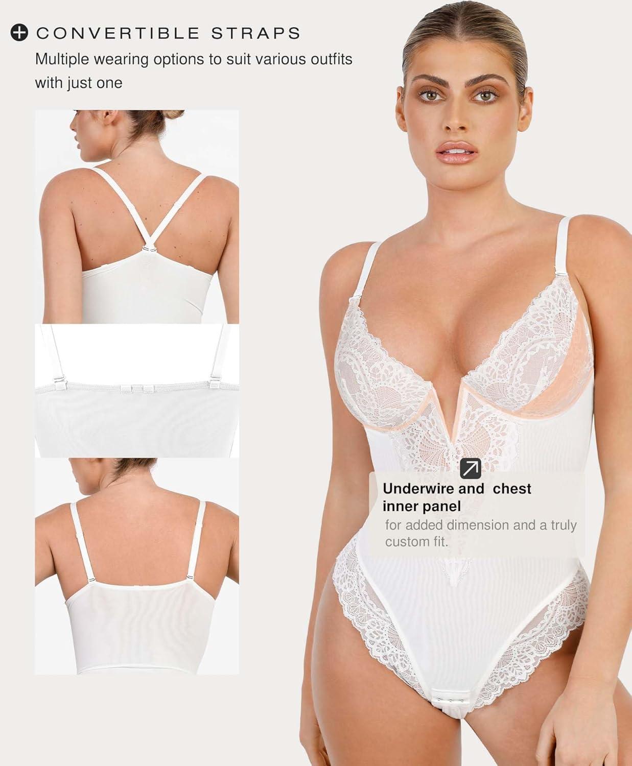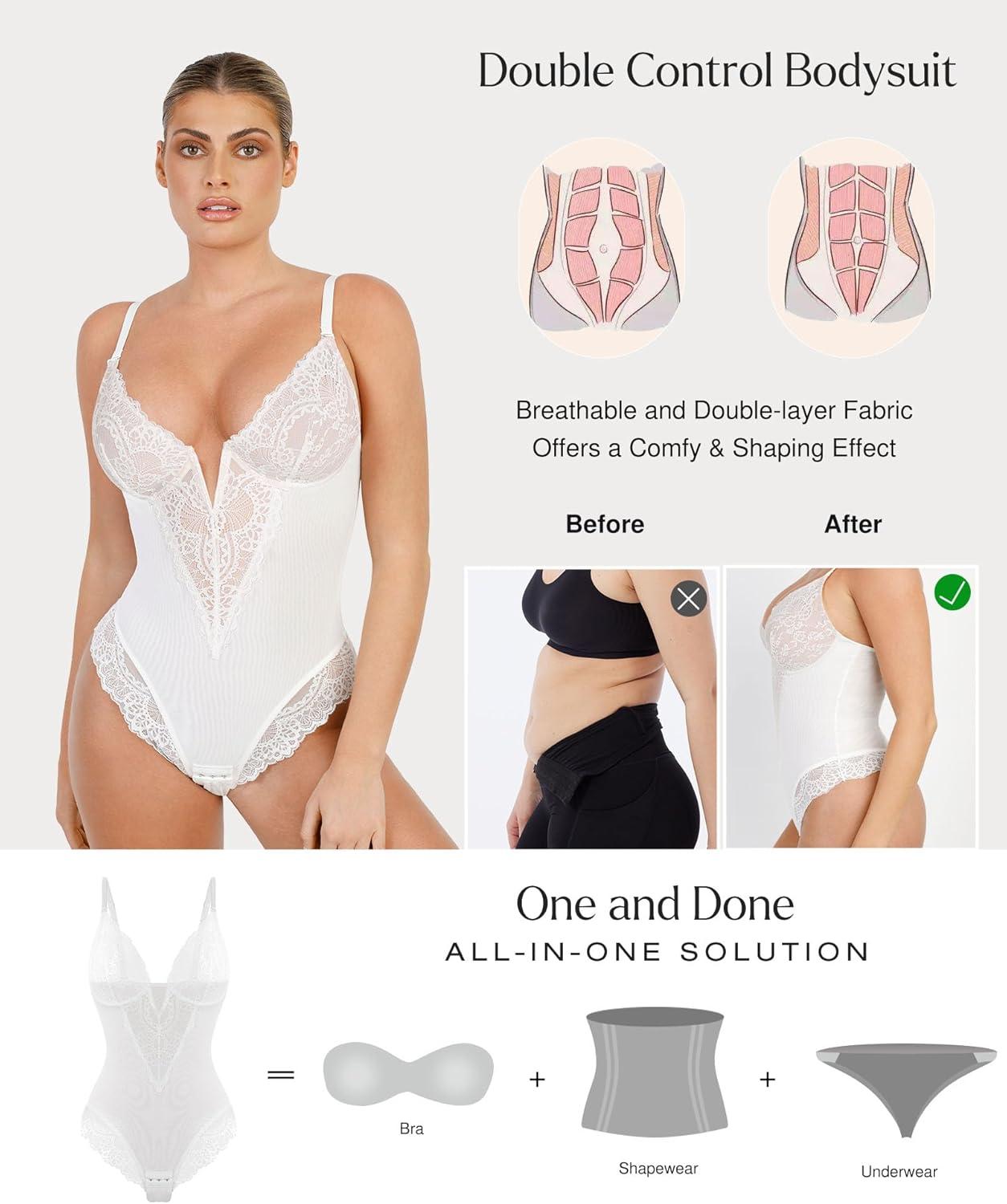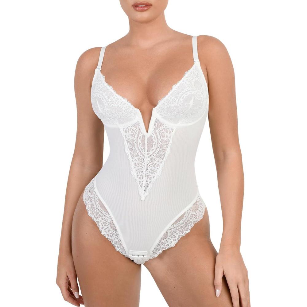 Popilush Shapewear Bodysuits for Women Lace Corset Tops Tummy Control V Neck Sleeveless Body Suit Thongs(White)