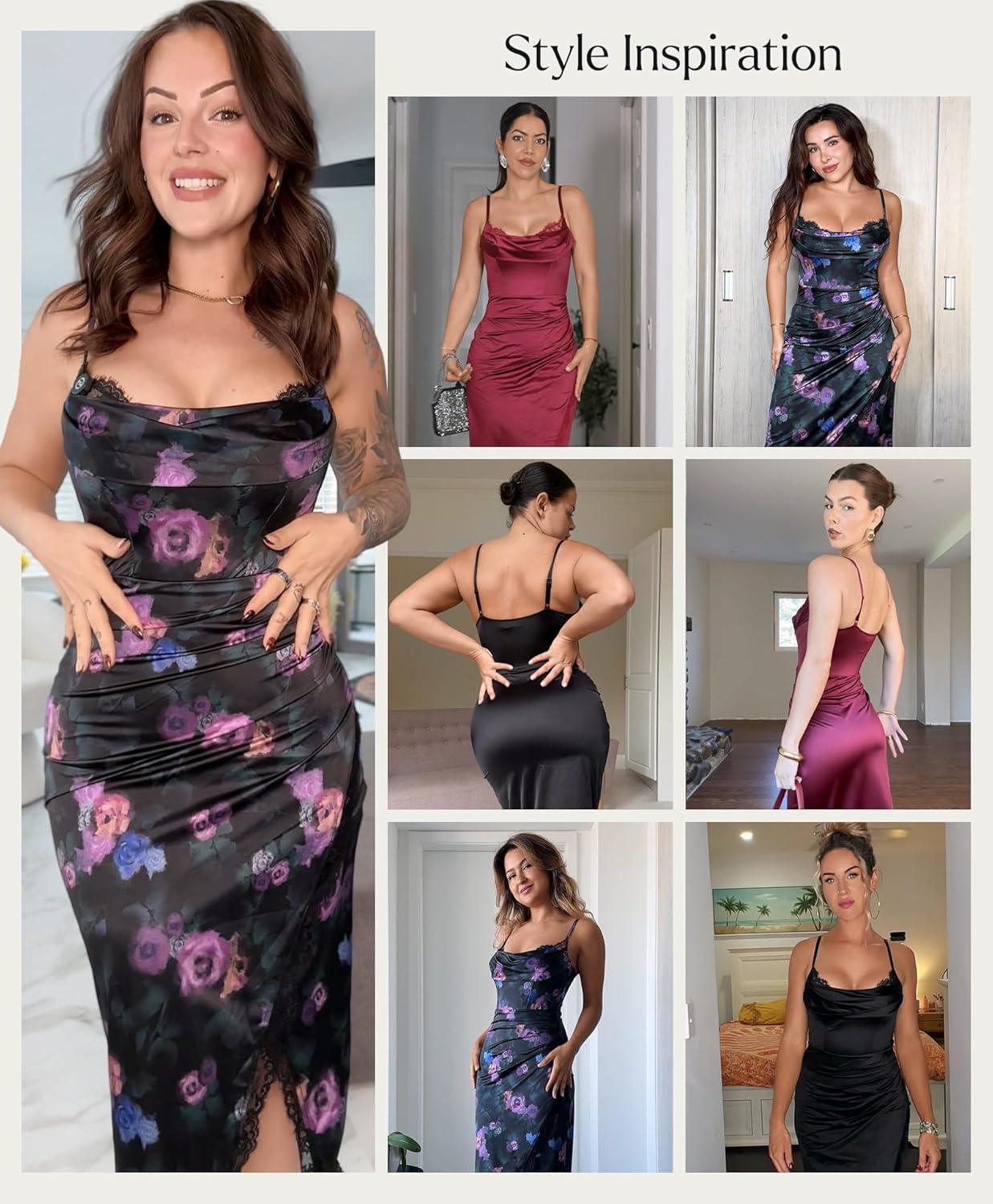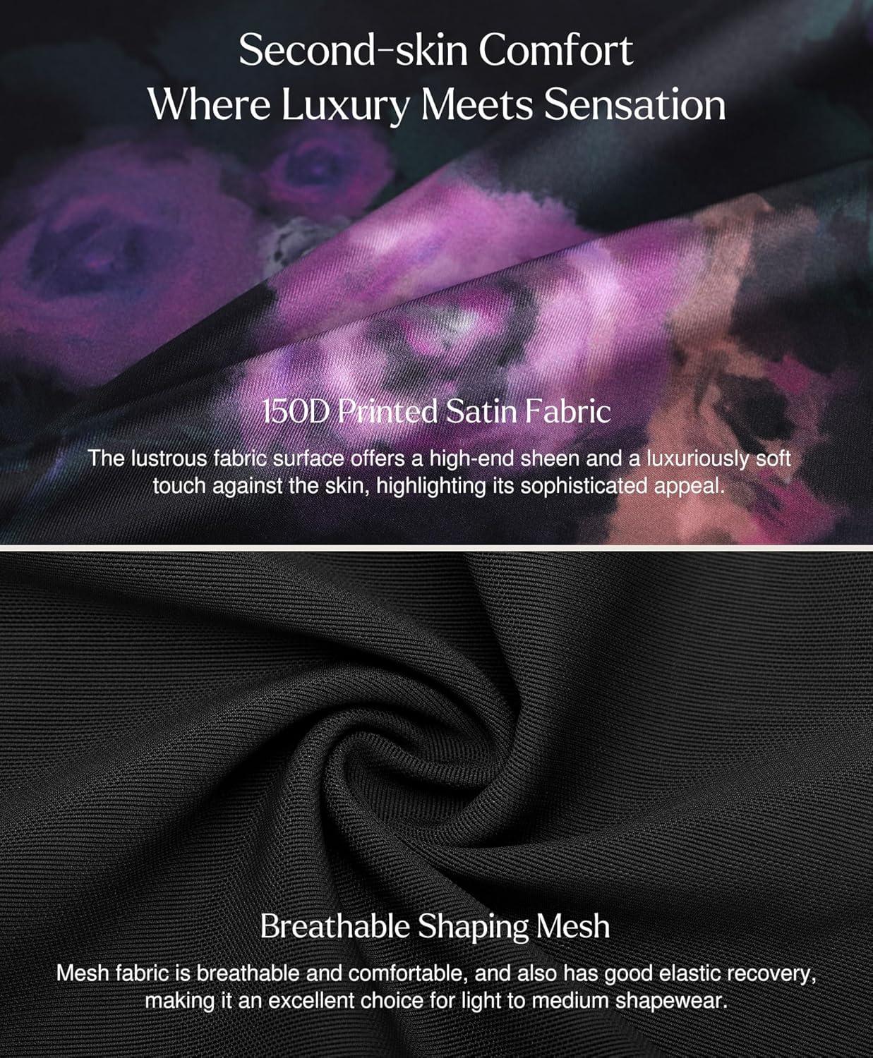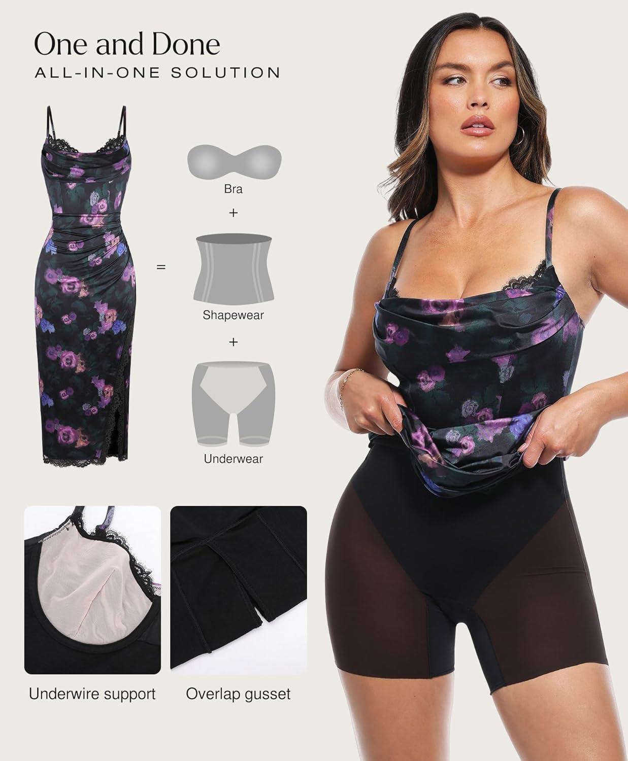 Popilush Shapewear Corset Dress Women's Satin Ruched Midi Dress Cocktail Date Night Dresses with Lace Trim Bra(Floral)