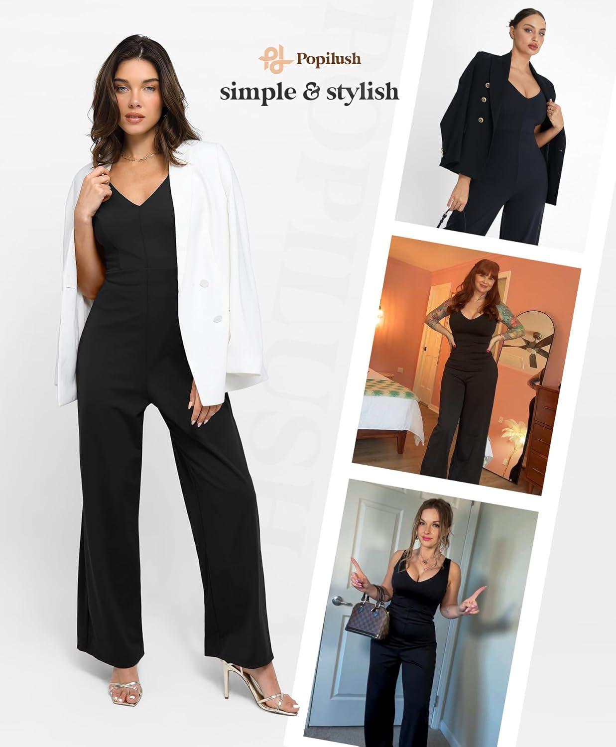 Popilush Jumpsuits for Women Dressy Casual Loose Overalls Sleeveless Rompers Outfits with Shapewear Adjustable Trouser Legs Black