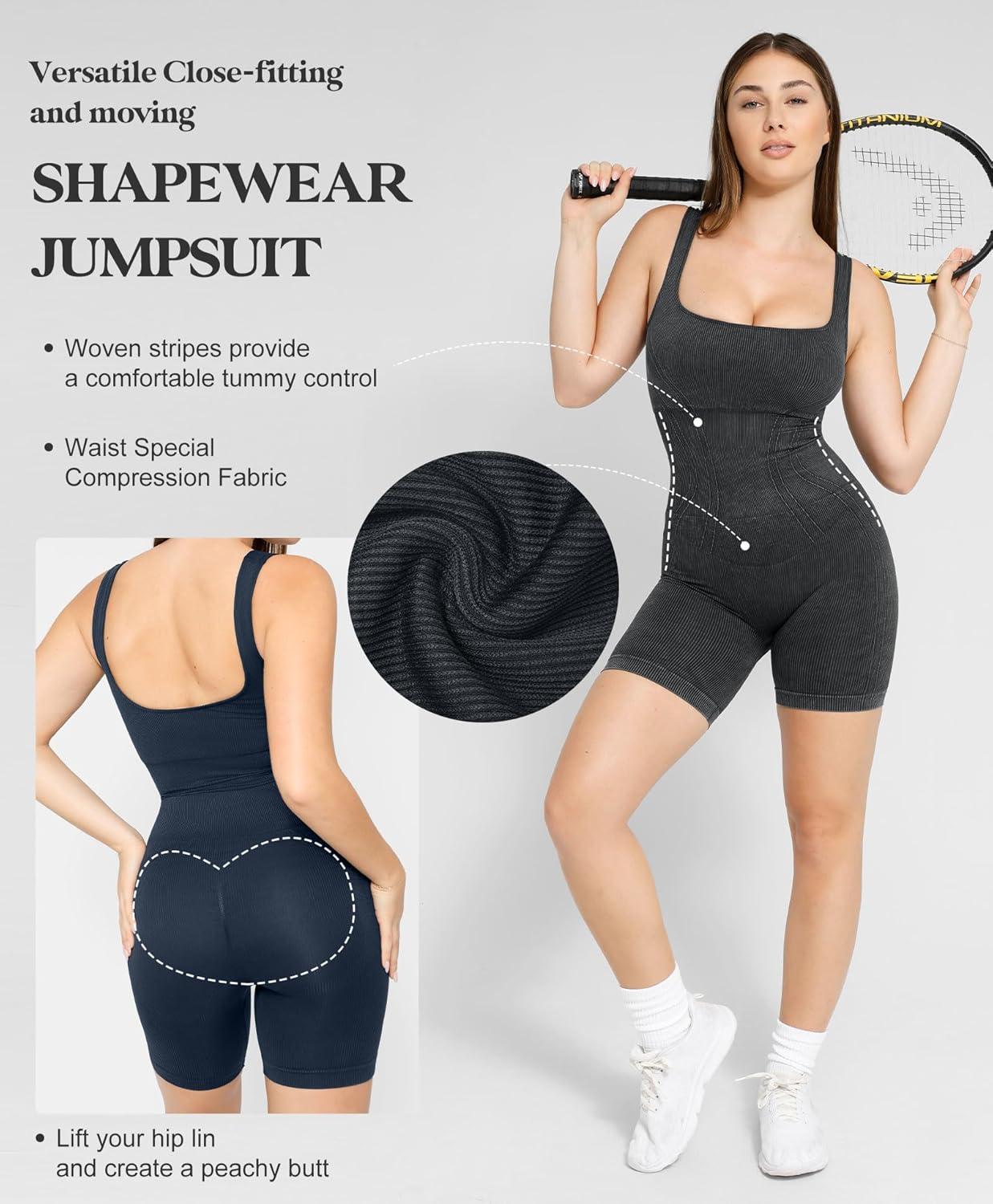 Popilush Shapewear Jumpsuits For Women Tummy Control Causual Jumpsuit Bodycon Formal Square Neck Romper(Black)
