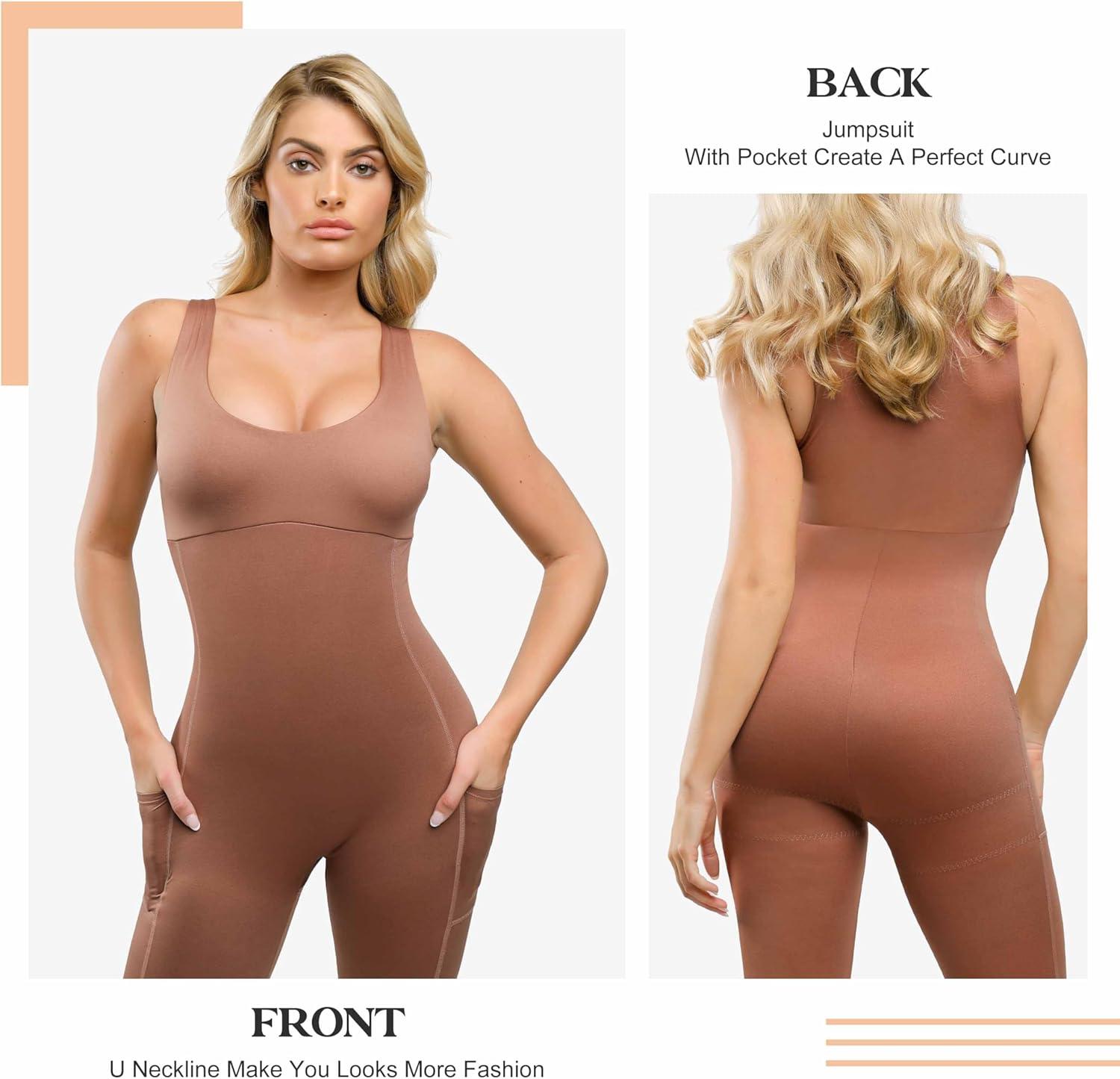 Popilush Shapewear Workout Jumpsuit for Women – Built In Shapewear Square Neck Romper with Pocket Bodysuit for Women(Brown Jumpsuit)