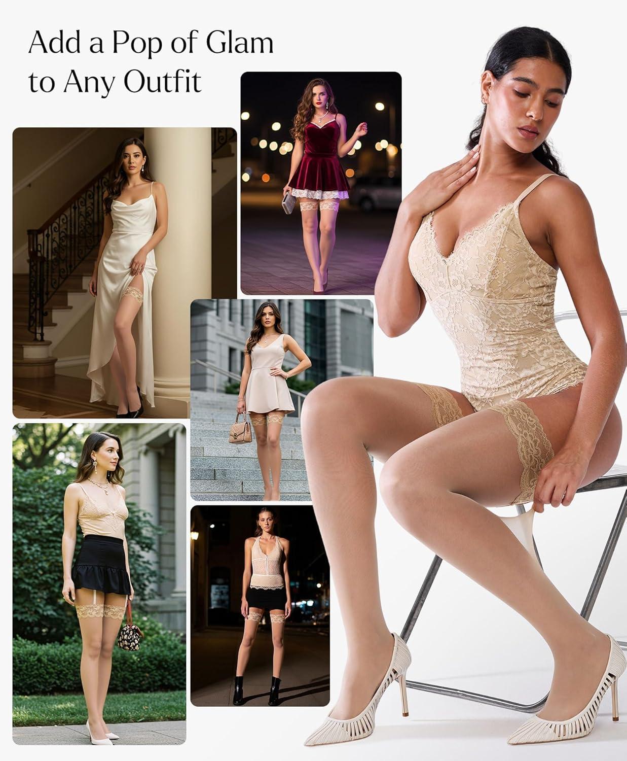 imagePopilush Thigh High Stockings for Women Silicone Lace Top Stay Up Silk Sheer PantyhoseNude