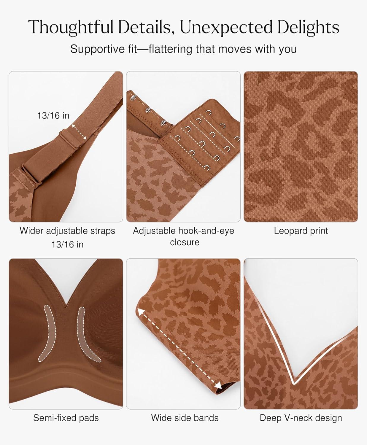 Popilush Wireless Bras Women Seamless No Underwire Push Up Bra Supportive Deep V Bralette Everyday Comfortable T-Shirt Bra(Leopard Brown)