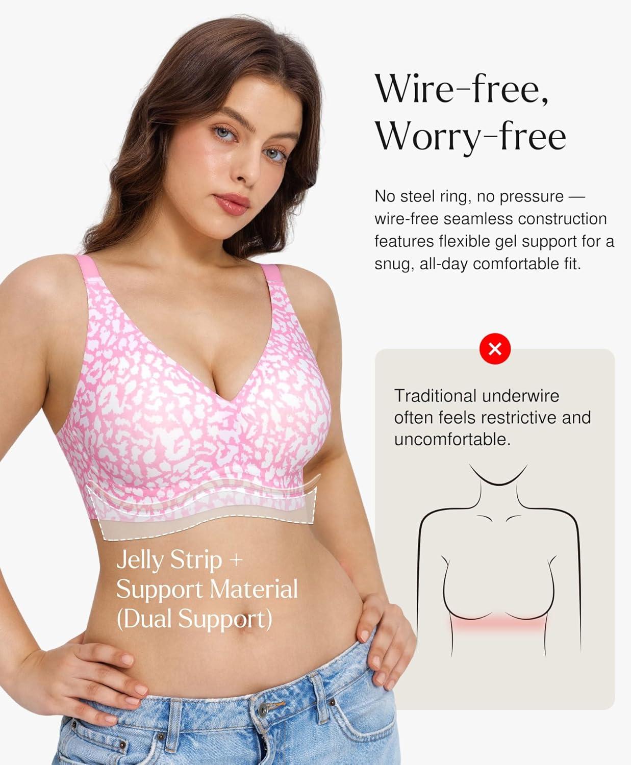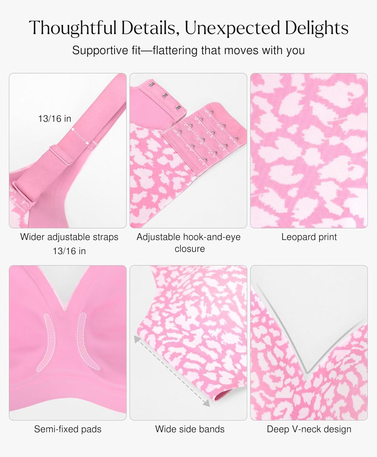 Popilush Wireless Bras Women Seamless No Underwire Push Up Bra Supportive Deep V Bralette Everyday Comfortable T-Shirt Bra(Leopard Pink)