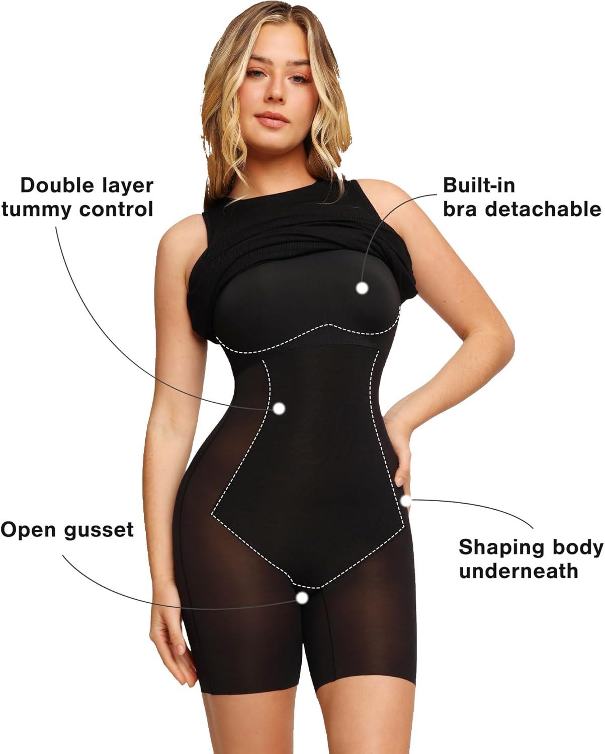 Popilush Shapewear Bodysuit for Women Deep V Neck Sleeveless Lace Corset Bodysuits Tummy Control Tank Tops(Dark Black)