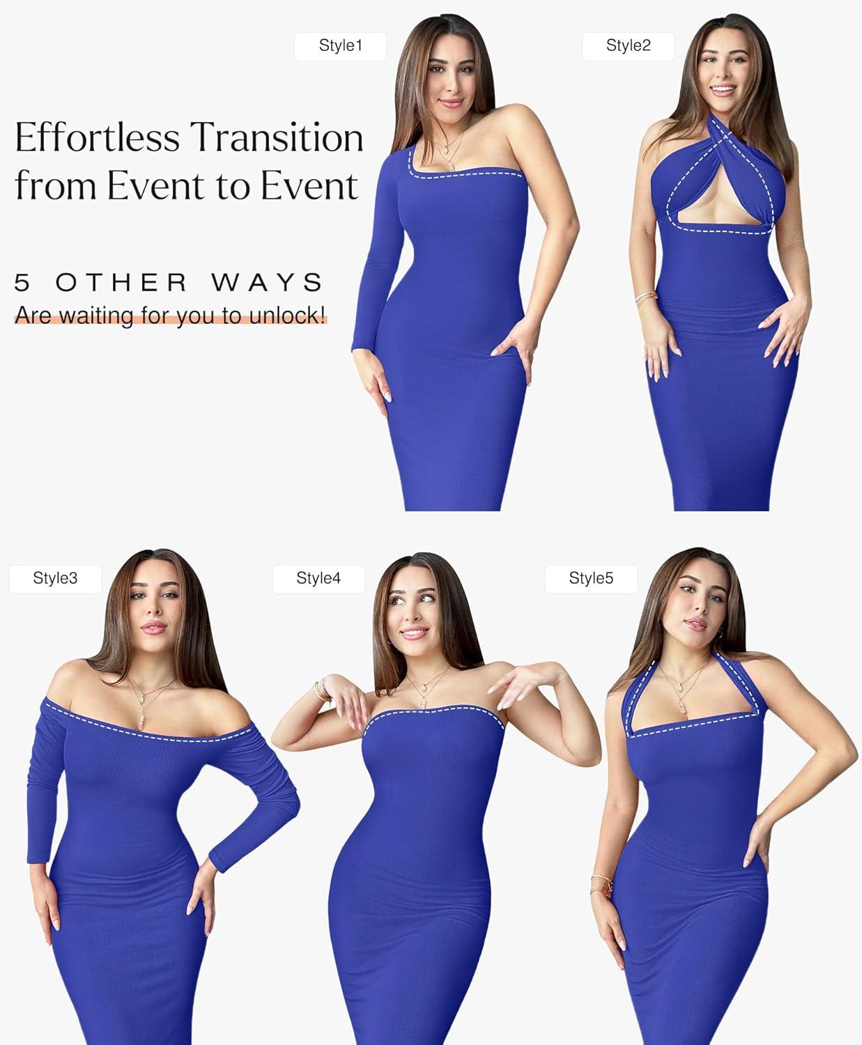 imagePopilush Womens Long Sleeve Maxi Dress Builtin Shapewear Bra Square Neck Fall Formal Wedding Guest Cocktail Bodycon DressesBlue
