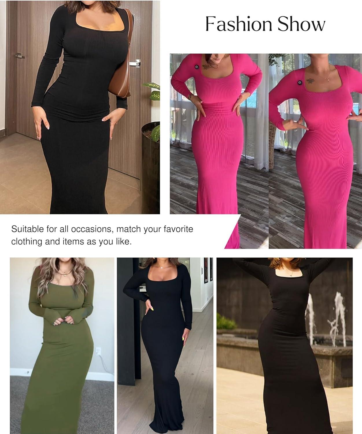 imagePopilush Womens Long Sleeve Maxi Dress Builtin Shapewear Bra Square Neck Fall Formal Wedding Guest Cocktail Bodycon DressesGrey
