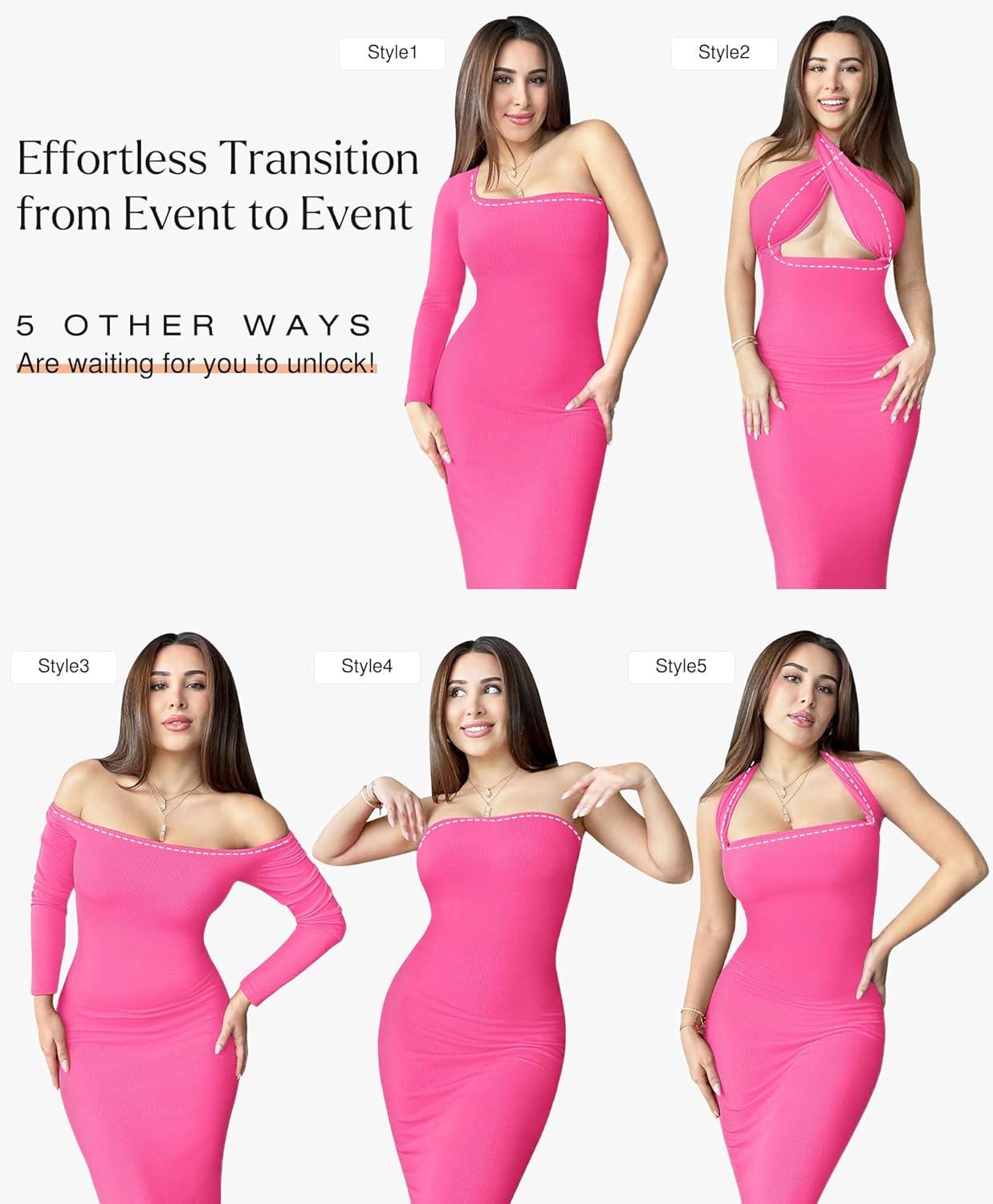 imagePopilush Womens Long Sleeve Maxi Dress Builtin Shapewear Bra Square Neck Fall Formal Wedding Guest Cocktail Bodycon DressesPink