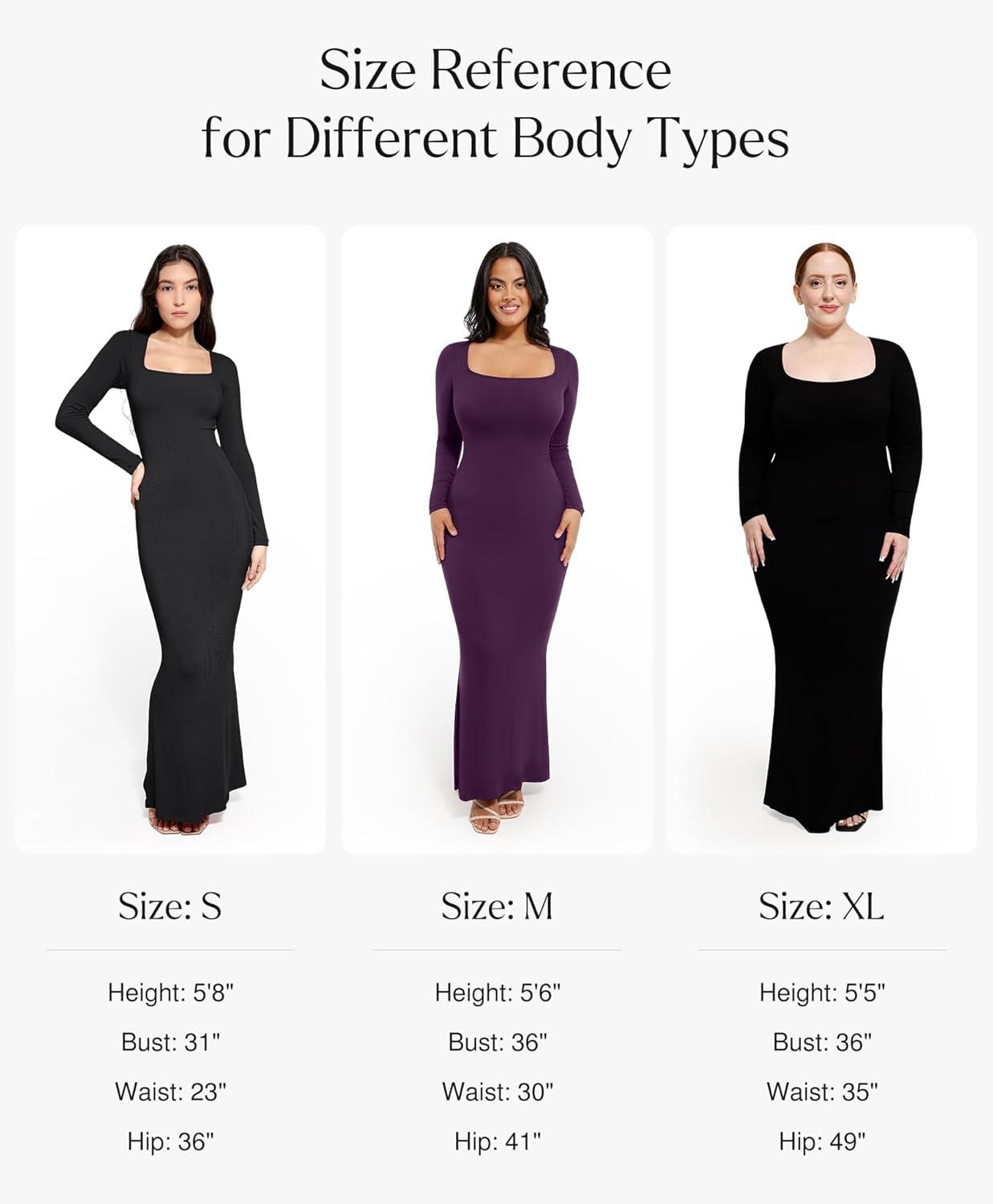 Popilush Women’s Long Sleeve Maxi Dress Built-in Shapewear Bra Square Neck Fall Formal Wedding Guest Cocktail Bodycon Dresses(Grey)